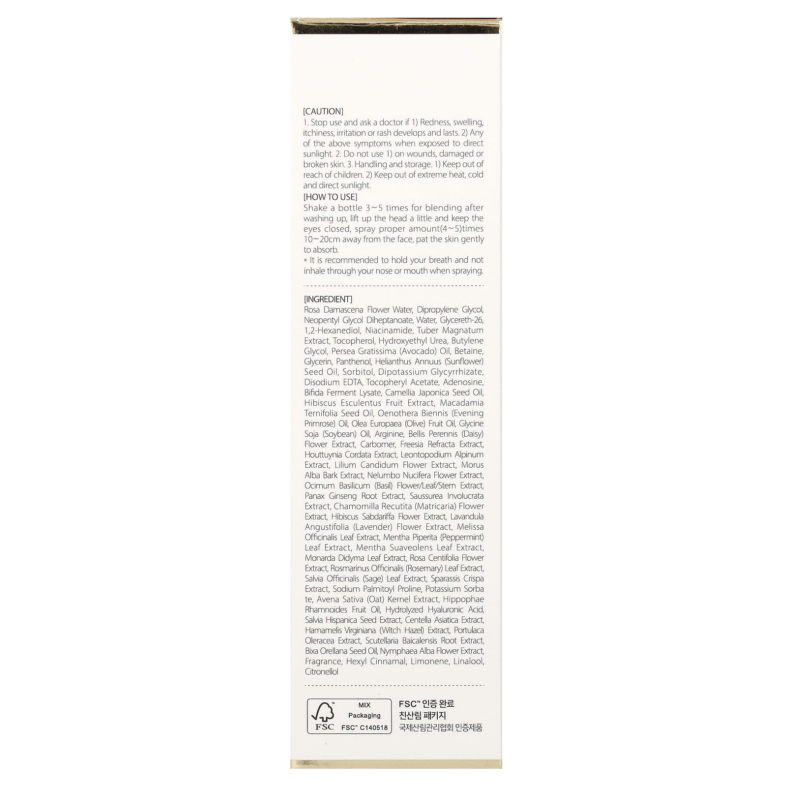 Água da flor de Rosa damascena, dimetildietilenoglicol, neopentyl glycol diheptanoate, água, gliceret-26,1,2-hexanediol, nicotinamida, extrato de Tuber magnatum, tocoferol, hydroxyethyl urea, butilenoglicol, óleo de Persea gratissima (abacate), betaína, glicerina, pantenol, óleo da semente de Helianthus annuus (girassol), sorbitol, dipotassium glycyrrhizate, edetato dissódico, acetato de tocoferol, adenosina, lisado do fermento de bífida, óleo da semente de Camellia japonica, extrato do fruto de Hibiscus esculentus, óleo da semente de Macadamia ternifolia, óleo de Oenothera biennis (prímula), óleo da fruta de Olea europaea (azeitona), óleo de Glycine soja (soja), arginina, extrato da flor de Bellis perennis (margarida), carbômero, extrato de Freesia refracta, extrato de Houttuynia cordata, extrato de Leontopodium alpinum, extrato da flor de Lilium candidum, extrato da casca de Morus alba, extrato da flor de Nelumbo nucifera, extrato da flor/folha/caule de Ocimum basilicum (manjericão), extrato de raiz de Panax ginseng, extrato de Saussurea involucrata, extrato da flor de Chamomilla recutita (matricária), extrato da flor de Hibiscus sabdariffa, extrato da flor de Lavandula angustifolia (lavanda), extrato da folha de Melissa officinalis, extrato da folha de Mentha piperita (hortelã-pimenta), extrato da folha de Mentha suaveolens, extrato da folha de Monarda %idyma, extrato da flor de Rosa centifolia, extrato da folha de Rosmarinus officinalis (alecrim), extrato da folha de Salvia officinalis (sálvia), extrato de Sparassis crispa, prolina palmitoil sódio, sorbato de potássio, extrato de Avena sativa (aveia), óleo da fruta de Hippophae rhamnoides, ácido hialurônico hidrolisado, extrato da semente de Salvia hispanica, extrato de Centella asiatica, extrato de Hamamelis virginiana (hamamélis), extrato de Portulaca oleracea, extrato da raiz de Scutellaria baicalensis, óleo da semente de Bixa orellana, extrato da flor de Nymphaea alba, fragrância, hexyl cinnamal, limoneno, linalol, citronellol.