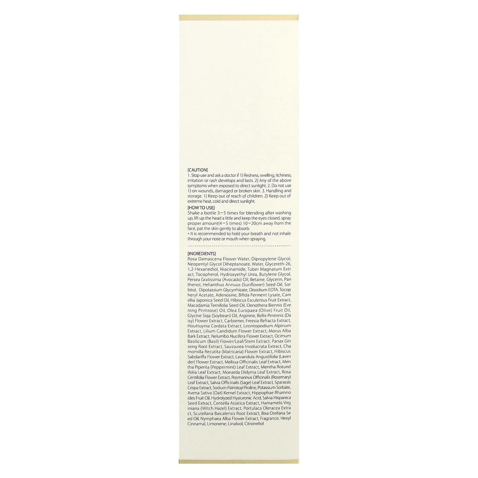 Água da flor de Rosa damascena, dimetildietilenoglicol, neopentyl glycol diheptanoate, água, glicerina-26,1,2-hexanodiol, niacinamida, extrato de tubérculo magnato, tocoferol, hydroxyethyl urea, butilenoglicol, óleo de Persea gratissima (abacate), betaína, glicerina, pantenol, óleo da semente de Helianthus annuus (girassol), sorbitol, dipotassium glycyrrhizate, edetato dissódico, acetato de tocoferol, adenosina, lisado do fermento de bífida, óleo de semente de Camellia japonica, extrato do fruto de Hibiscus esculentus, óleo da semente de Macadamia ternifolia, óleo de Oenothera biennis (prímula), óleo da fruta de Olea europaea (azeitona), óleo de Glycine soja (soja), arginina, extrato da flor de Bellis perennis (margarida), carbômer, extrato de Freesia refracta, extrato de Houttuynia cordata, extrato de Leontopodium alpinum, extrato da flor de Lilium candidum, extrato da casca de Morus alba, extrato da flor de Nelumbo nucifera, extrato da flor / folha / caule de ocimum basilicum (manjericão), extrato da raiz de Panax ginseng, extrato de Saussurea involucrata, extrato da flor de Chamomilla recutita (matricária), extrato da flor de Hibiscus sabdariffa, extrato da flor de Lavandula angustifolia (lavanda), extrato da folha de Melissa officinalis, extrato da folha de Mentha piperita (hortelã-pimenta), extrato da folha de Mentha rotundifolia, extrato da folha de Monarda didyma, extrato da flor de Rosa centifolia, extrato da folha de Rosmarinus officinalis (alecrim), extrato da folha de Salvia officinalis (sálvia), extrato de Sparassis crispa, prolina palmitoil sódio, sorbato de potássio, extrato de Avena sativa (aveia), óleo da fruta de Hippophae rhamnoides, ácido hialurônico hidrolisado, extrato da semente de Salvia hispanica, extrato de Centella asiatica, extrato de Hamamelis virginiana (hamamélis), extrato de Portulaca oleracea, extrato da raiz de Scutellaria baicalensis, óleo da semente de bixa orellana, extrato da flor de Nymphaea alba, fragrância, hexyl cinnamal, limoneno, linalol, citronellol.