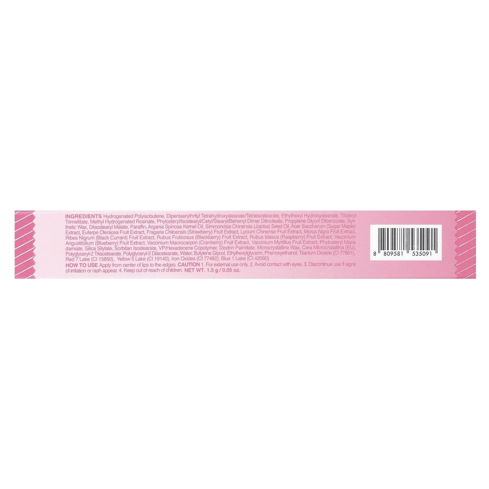 Poli-isobutileno hidrogenado, dipentaeritritol tetrahydroxystearate/tetraisostearate, hidroxiestearato de etilhexilo, tridecyl trimelitate, rosinato hidrogenado de metila, fitoesterol/isoestearil/cetil/estearil/behenyl dimer dilinoleate, dibenzoato de propilenoglicol, cera sintética, malato de diisoestearila, parafina, óleo do grão de Argania spinosa, óleo da semente de Simmondsia chinensis (jojoba), extrato de Acer saccharum (bordo-açucareiro), extrato da fruta de Euterpe oleracea, extrato da fruta de Fragaria chiloensis (morango), extrato da fruta de Lycium chinense, extrato da fruta de Morus nigra, extrato da fruta de Ribes nigrum (groselha negra), extrato da fruta de Rubus fruticosus (amora), extrato da fruta de Rubus idaeus (framboesa), extrato da fruta de Vaccinium angustifolium (mirtilo), extrato da fruta de Vaccinium macrocarpon (cranberry), extrato da fruta de Vaccinium myrtillus, Phytosteryl maca damiate, sililato de sílica, isostearato de sorbitana, copolímero hexadeceno/vp, palmitato de dextrina, cera microcristalina, cera microcristalina (eu), triisoestearato de poliglicerila-2, diisoestearato de poliglicerila-2, água, butilenoglicol, ethylhexylglycerin, fenoxietanol, dióxido de titânio (CI 77891), vermelho 7 laca de alumínio (CI 15850), amarelo 5 laca de alumínio (CI 19140), óxidos de ferro (CI 77492), azul brilhante laca de alumínio (CI 42090).