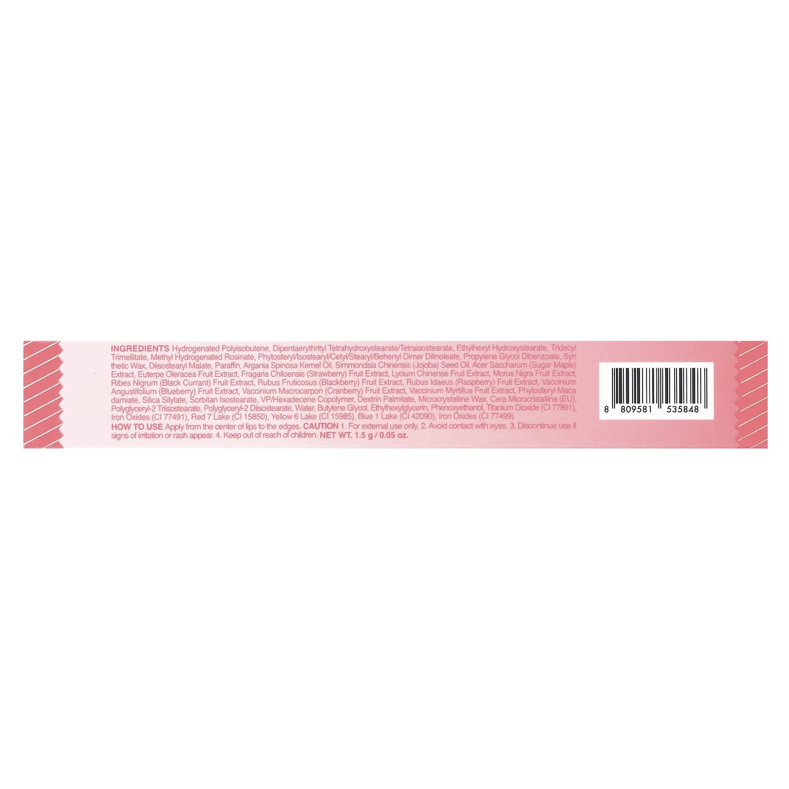 Poli-isobutileno hidrogenado, dipentaeritritol tetrahydroxystearate/tetraisostearate, hidroxiestearato de etilhexilo, tridecyl trimelitate, rosinato hidrogenado de metila, fitoesterol/isoestearil/cetil/estearil/behenyl dimer dilinoleate, dibenzoato de propilenoglicol, cera sintética, malato de diisoestearila, parafina, óleo do grão de Argania spinosa, óleo da semente de Simmondsia chinensis (jojoba), extrato de Acer saccharum (bordo-açucareiro), extrato da fruta de Euterpe oleracea, extrato da fruta de Fragaria chiloensis (morango), extrato da fruta de Lycium chinense, extrato da fruta de Morus nigra, extrato da fruta de Ribes nigrum (groselha negra), extrato da fruta de Rubus fruticosus (amora), extrato da fruta de Rubus idaeus (framboesa), extrato da fruta de Vaccinium angustifolium (mirtilo), extrato da fruta de Vaccinium macrocarpon (cranberry), extrato da fruta de Vaccinium myrtillus, Phytosteryl maca damiate, sililato de sílica, isostearato de sorbitana, copolímero hexadeceno/vp, palmitato de dextrina, cera microcristalina, cera microcristalina (eu) polyglyceryl-2 triisostearate, diisoestearato de poliglicerila-2, água, butilenoglicol, ethylhexylglycerin, fenoxietanol, dióxido de titânio (CI 77891), óxidos de ferro (CI 77491), vermelho 7 laca de alumínio (CI 15850), amarelo crepúsculo laca de alumínio (CI 15985), azul brilhante laca de alumínio (CI 42090), óxidos de ferro (CI 77499).