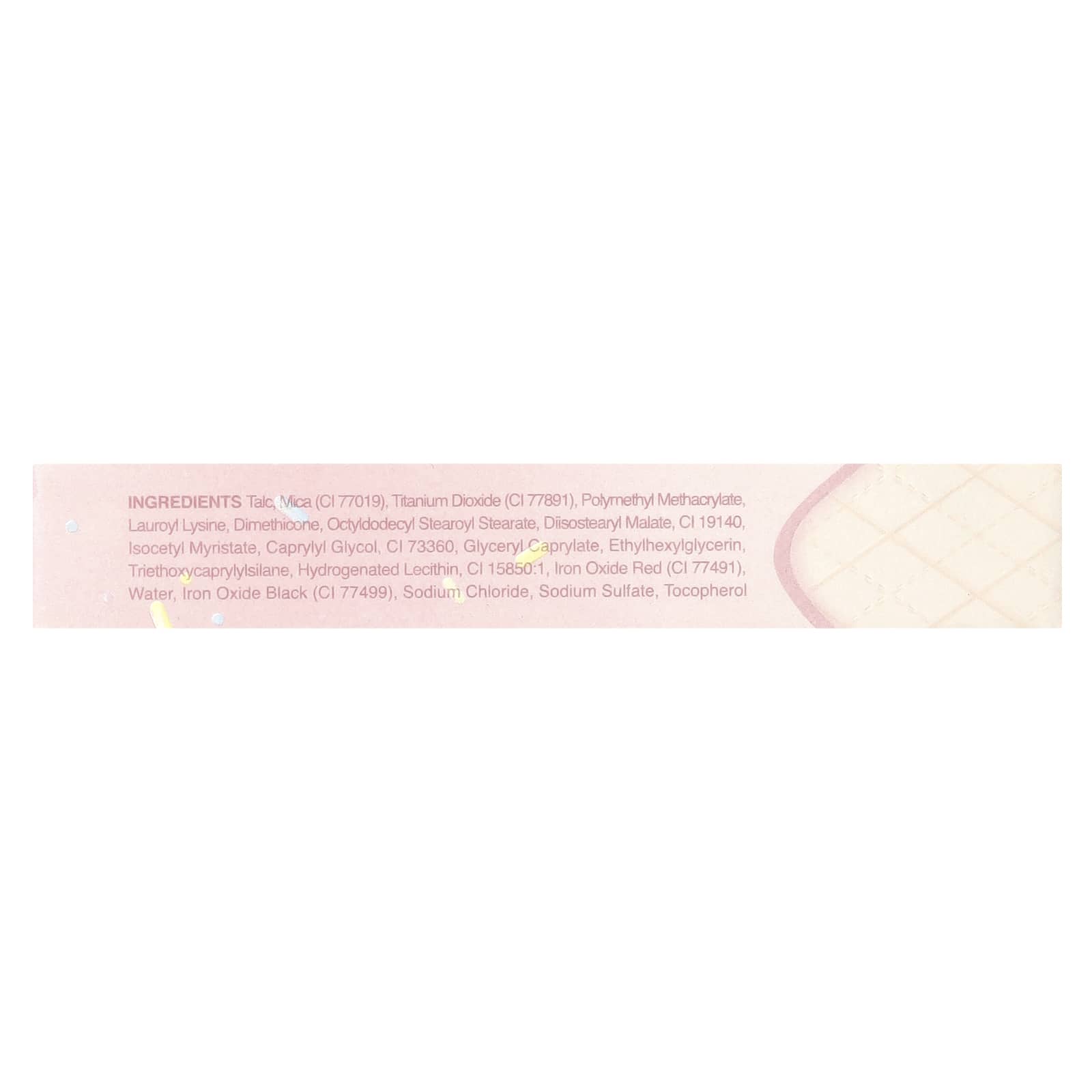 Talco e mica (CI 77019), dióxido de titânio (CI 77891), metacrilato de polimetilo, lauroil lisina, dimeticona, estearato de octildodecil stearoyl, malato de diisoestearila, CI 19140, miristato de isocetil, caprylyl glycol, CI 73360, caprilato de glicerila, ethylhexylglycerin, trietoxicaprililsilano, lecitina hidrogenada, CI 15850:1, vermelho óxido de ferro (CI 77491), água, óxido de ferro preto (CI 77499), cloreto de sódio, sulfato de sódio, tocoferol.