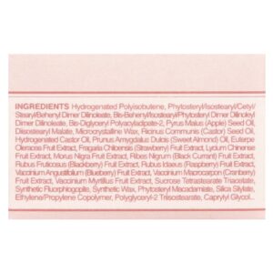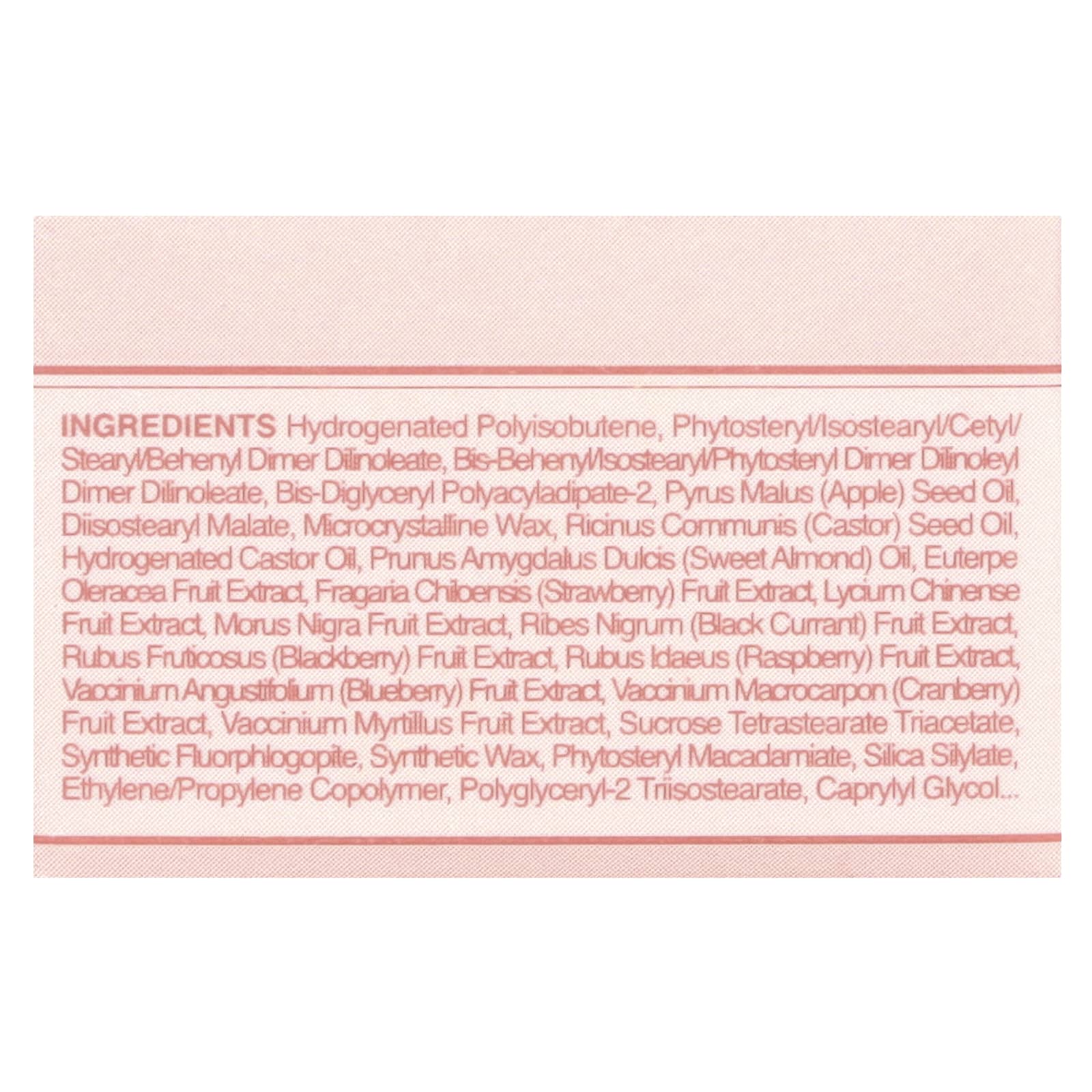 Poli-isobutileno hidrogenado, fitoesterol/isoestearil/cetil/estearil/behenyl dimer dilinoleate, bis-behenyl/isostearyl/fitosteryl dimer dilinoleate, dilinoleato de dímero, bis-diglicerila poliaciladipato-2, óleo da semente de Pyrus malus (maçã), malato de diisoestearila, cera microcristalina, óleo da semente de Ricinus communis (rícino) óleo de rícino hidrogenado, óleo de Prunus amygdalus dulcis (amêndoa doce), extrato da fruta de Euterpe oleracea, extrato da fruta de Fragaria chiloensis (morango), extrato da fruta de Lycium chinense, extrato da fruta de Morus nigra, extrato da fruta de Ribes nigrum (groselha negra), extrato da fruta de Rubus fruticosus (amora), extrato da fruta de Rubus idaeus (framboesa), extrato da fruta de Vaccinium angustifolium (mirtilo), extrato da fruta de Vaccinium macrocarpon (cranberry), extrato da fruta de Vaccinium myrtillus, sacarose tetrastearate, triacetato e fluorflogopite sintética, cera sintética, fitoesterol do macadâmia, sililato de sílica, copolímero de etileno/propileno, triisoestearato de poliglicerila-2, caprylyl glycol caprylate caprylate, diisoestearato de poliglicerila-2, butilenoglicol de água, ethylhexylglycerin, fenoxietanol, fragrância (perfume), álcool benzílico, limoneno, amarelo 5 laca de alumínio (CI 19140), vermelho 6 (Cl 15850), dióxido de titânio (CI 77891), vermelho 28 laca de alumínio (CI 45410), óxidos de ferro (CI 77491), vermelho 27 (Cl 45410), vermelho 7 laca de alumínio (CI 15850).