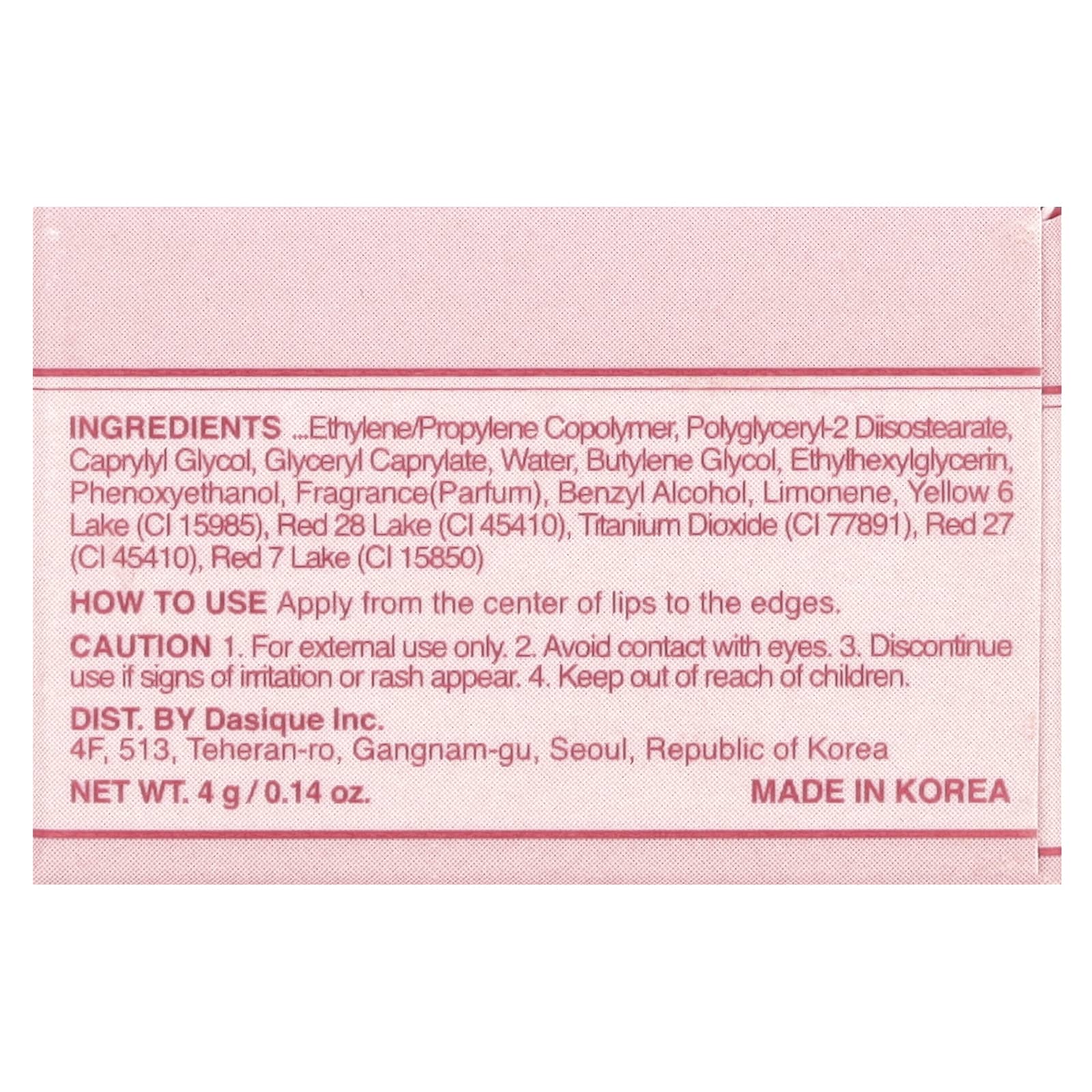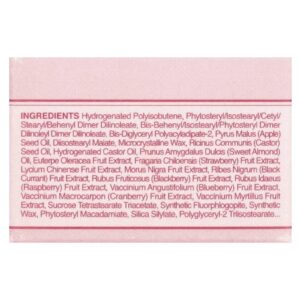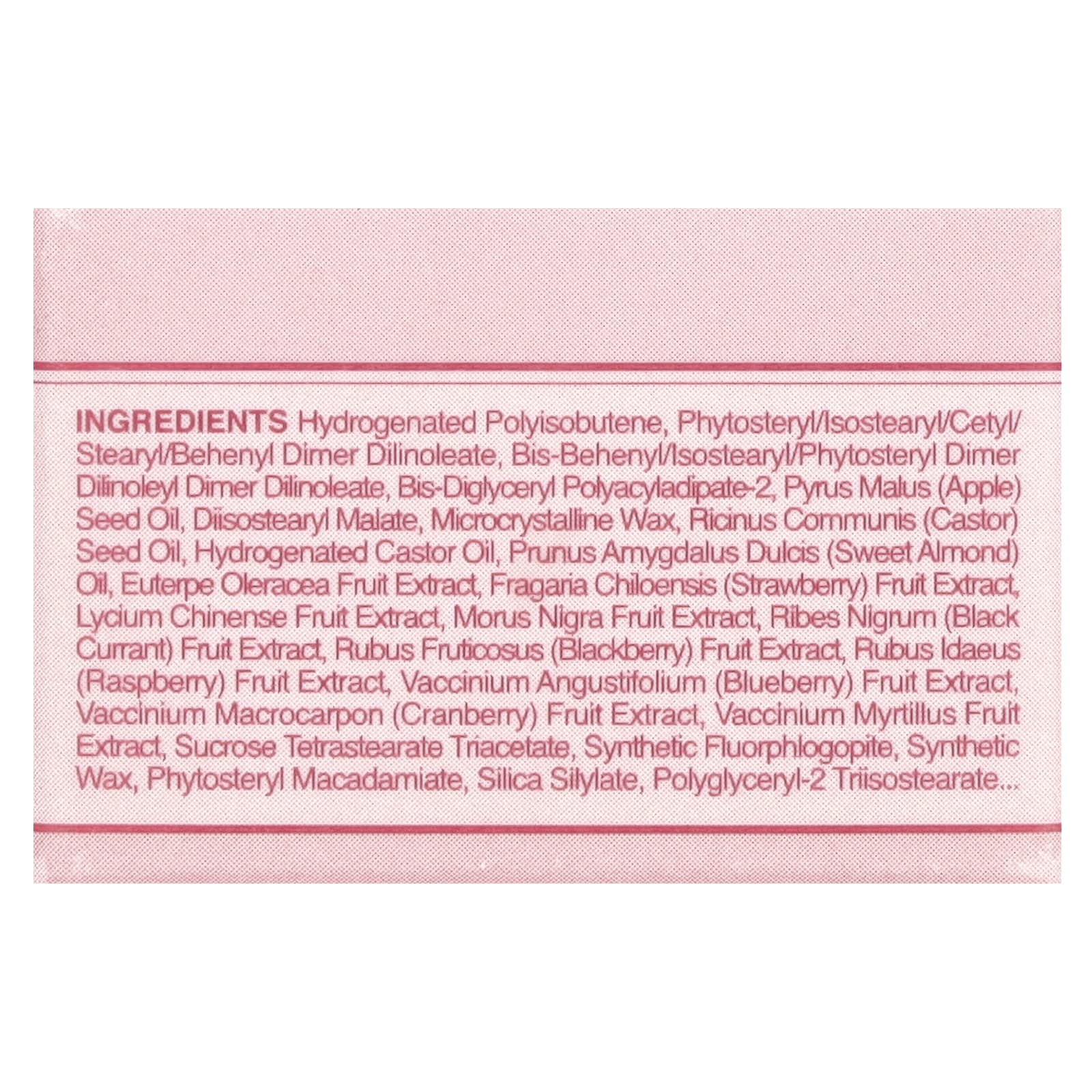 Poli-isobutileno hidrogenado, fitoesterol/isoestearil/cetil/estearil/behenyl dimer dilinoleate, dímero de bis-behenil/isoestearílico/fitoesteril dilinoleato de dímero de bis-behenil/isoestearílico, bis-diglicerila poliaciladipato-2, óleo da semente de Pyrus malus (maçã), malato de diisoestearoil, cera microcristalina, óleo da semente de Ricinus communis (rícino), óleo de rícino hidrogenado, óleo de Prunus amygdalus dulcis (amêndoa doce), extrato da fruta de Euterpe oleracea, extrato da fruta de Fragaria chiloensis (morango), extrato da fruta de Lycium chinense, extrato da fruta de Morus nigra, extrato da fruta de Ribes nigrum (groselha negra), extrato da fruta de Rubus fruticosus (amora), extrato da fruta de Rubus idaeus), extrato da fruta de Vaccinium angustifolium (mirtilo), extrato da fruta de Vaccinium macrocarpon (cranberry), extrato da fruta de Vaccinium myrtillus, triacetato de tetraestearato de sacarose, fluoroflogopita sintética, cera sintética, fitoesterol do macadâmia, sililato de sílica, copolímero de etileno/propileno polyglyceryl-2 triisostearate, polyglyceryl-2 diisostearate caprylyl glycol, caprilato de glicerila, água, butilenoglicol, ethylhexylglycerin, fenoxietanol, fragrância (perfume), álcool benzílico, limoneno, amarelo 6 laca de alumínio (Cl 15985), vermelho 28 laca de alumínio (CI 45410), dióxido de titânio (CI 77891), vermelho 27 (c) 45410), vermelho 7 laca de alumínio (Cl 15850).
