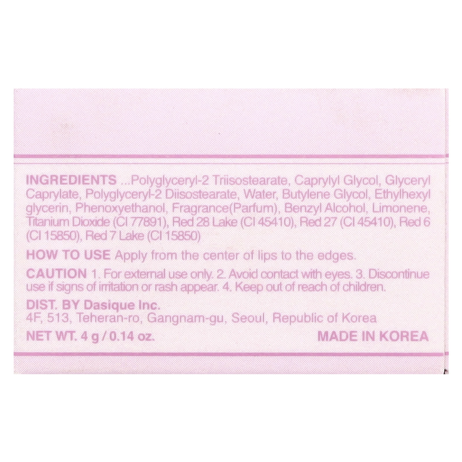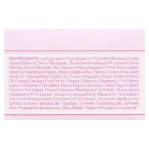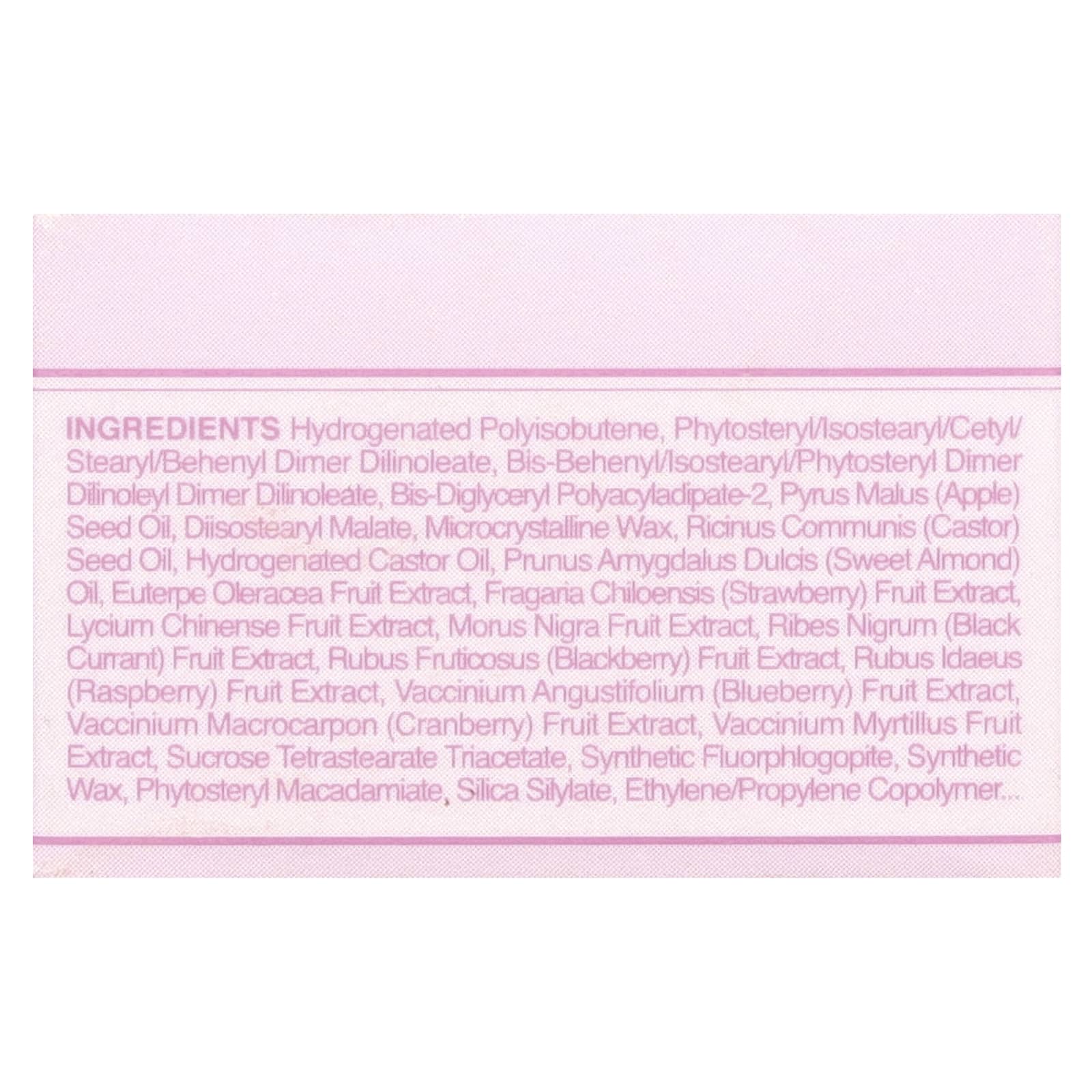 Poli-isobutileno hidrogenado, fitoesterol/isoestearil/cetil/estearil/behenyl dimer dilinoleate, dímero de bis-behenil/isoestearílico/fitoesteril dilinoleato de dímero de bis-behenil/isoestearílico, bis-diglicerila poliaciladipato-2, Pyrus malus (óleo da semente de maçã, malato de diisoestearila, cera microcristalina, óleo da semente de Ricinus communis (rícino), óleo de rícino hidrogenado, óleo de Prunus amygdalus dulcis (amêndoa doce), extrato da fruta de Euterpe oleracea, extrato da fruta de Fragaria chiloensis (morango), extrato da fruta de Lycium chinense, extrato da fruta de Morus nigra, extrato da fruta de Ribes nigrum (groselha negra), extrato da fruta de Rubus fruticosus (amora), extrato da fruta de Rubus idaeus (framboesa), extrato da fruta de Vaccinium angustifolium (mirtilo), extrato da fruta de Vaccinium macrocarpon (cranberry), extrato da fruta de Vaccinium myrtillus, triacetato de tetraestearato de sacarose, fluoroflogopita sintética, cera sintética, fitoesterol do macadâmia, sililato de sílica, copolímero de etileno/propileno, triisoestearato de poliglicerila-2, caprylyl glycol, caprilato de glicerila, diisoestearato de poliglicerila-2, água, butilenoglicol, ethylhexylglycerin, fenoxietanol, fragrância (perfume), álcool benzílico, limoneno e dióxido de titânio (CI 77891), vermelho 28 laca de alumínio (CI 45410), vermelho 27 (CI 45410), vermelho 6 (CI 15850), vermelho 7 laca de alumínio (CI 15850).