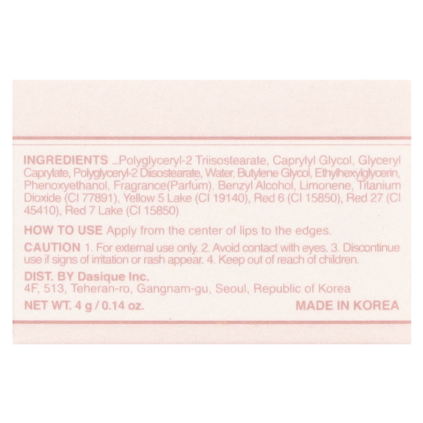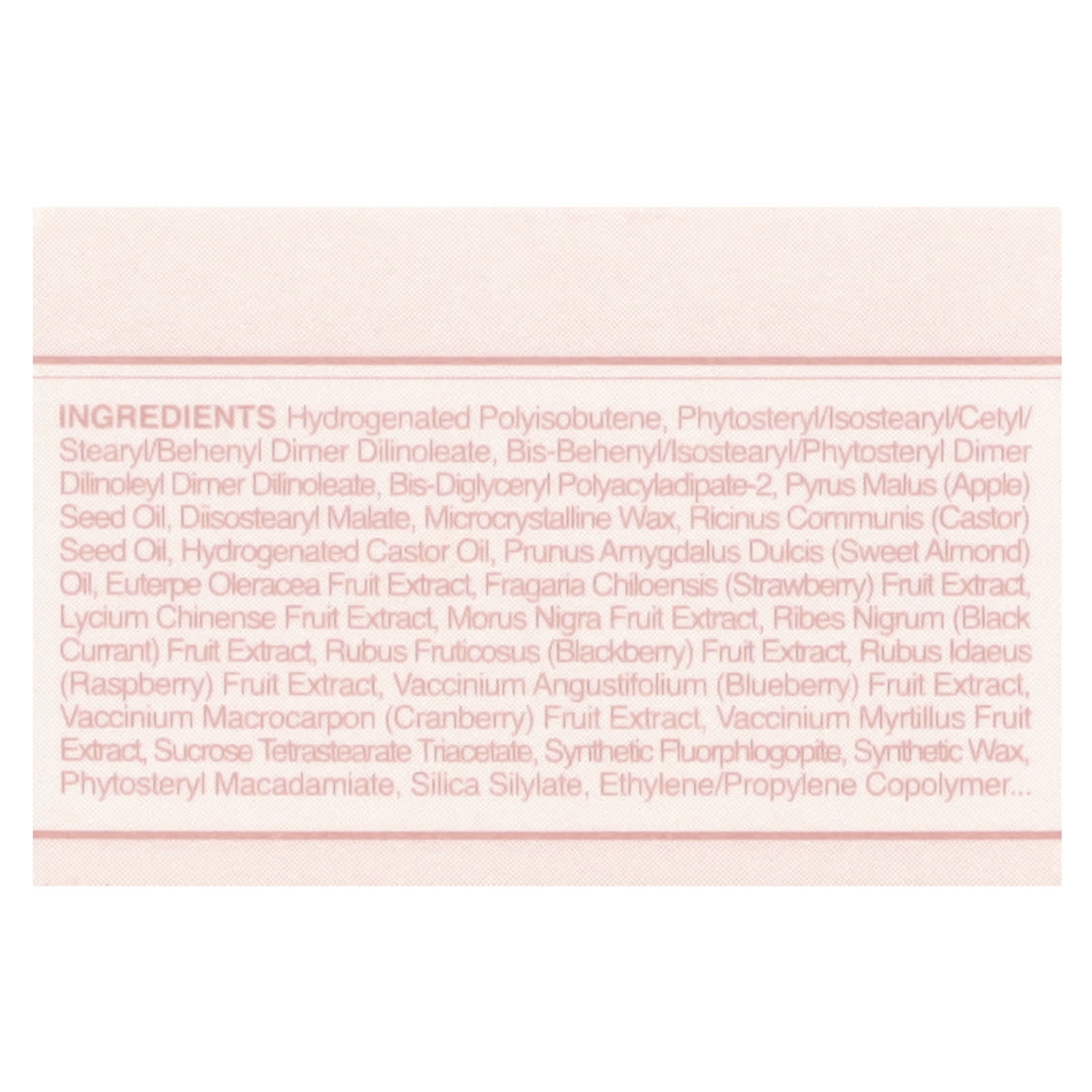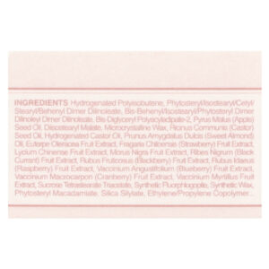 Poli-isobutileno hidrogenado, fitoesterol/isoestearil/cetil/estearil/behenyl dimer dilinoleate, dímero de bis-behenil/isoestearílico/fitoesteril dilinoleato de dímero de bis-behenil/isoestearílico, bis-diglicerila poliaciladipato-2, Pyrus malus (óleo da semente de maçã, malato de diisoestearila, cera microcristalina, óleo da semente de Ricinus communis (rícino), óleo de rícino hidrogenado, óleo de Prunus amygdalus dulcis (amêndoa doce), extrato da fruta de Euterpe oleracea, extrato da fruta de Fragaria chiloensis (morango) extrato da fruta de Lycium chinense, extrato da fruta de Morus nigra, extrato da fruta de Ribes nigrum (groselha negra), extrato da fruta de Rubus fruticosus (amora), extrato da fruta de Rubus idaeus), extrato da fruta de Vaccinium angustifolium (mirtilo), extrato da fruta de Vaccinium macrocarpon (cranberry), extrato da fruta de Vaccinium myrtillus, triacetato de tetraestearato de sacarose, fluoroflogopita sintética, cera sintética, fitoesterol do macadâmia, sililato de sílica, copolímero de etileno/propileno, triisoestearato de poliglicerila-2, caprylyl glycol, caprilato de glicerila, diisoestearato de poliglicerila-2, água, butilenoglicol, ethylhexylglycerin, fenoxietanol, fragrância (perfume), álcool benzílico, limoneno, dióxido de titânio (CI 77891), amarelo 5 laca de alumínio (CI 19140), vermelho 6 (CI 15850), vermelho 27 (CI 45410), vermelho 7 laca de alumínio (C) 15850.