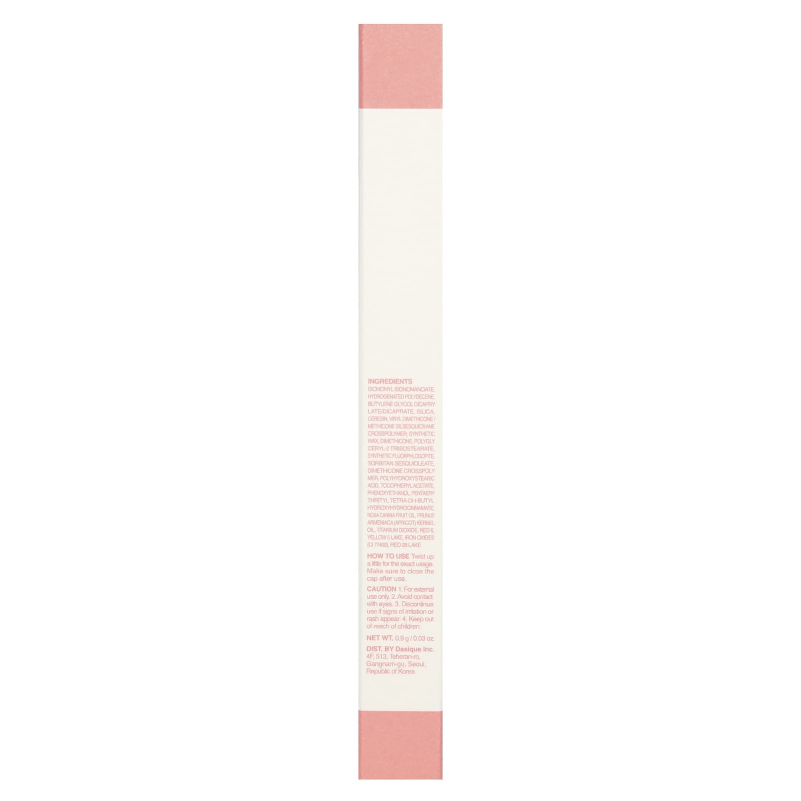 Isononil isononanoato, polideceno hidrogenado, dicaprylate/dicaprate de butilenoglicol, sílica, ceresina, vinyl dimethicone/methicone silsesquioxane crosspolymer, cera sintética, dimeticona, triisoestearato de poliglicerila-2, fluoroflogopita sintética, sesquioleato de sorbitana, crospolímero de dimeticona, ácido polihidroxiesteárico, acetato de tocoferol, fenoxietanol, pentaeritril tetra-di-butyl hydroxyhydrocinnamate, óleo da fruta de Rosa canina, óleo da semente de Prunus armeniaca (damasco), dióxido de titânio, vermelho 6, amarelo 5 laca de alumínio, óxidos de ferro (CI 77492), vermelho 28 laca de alumínio.