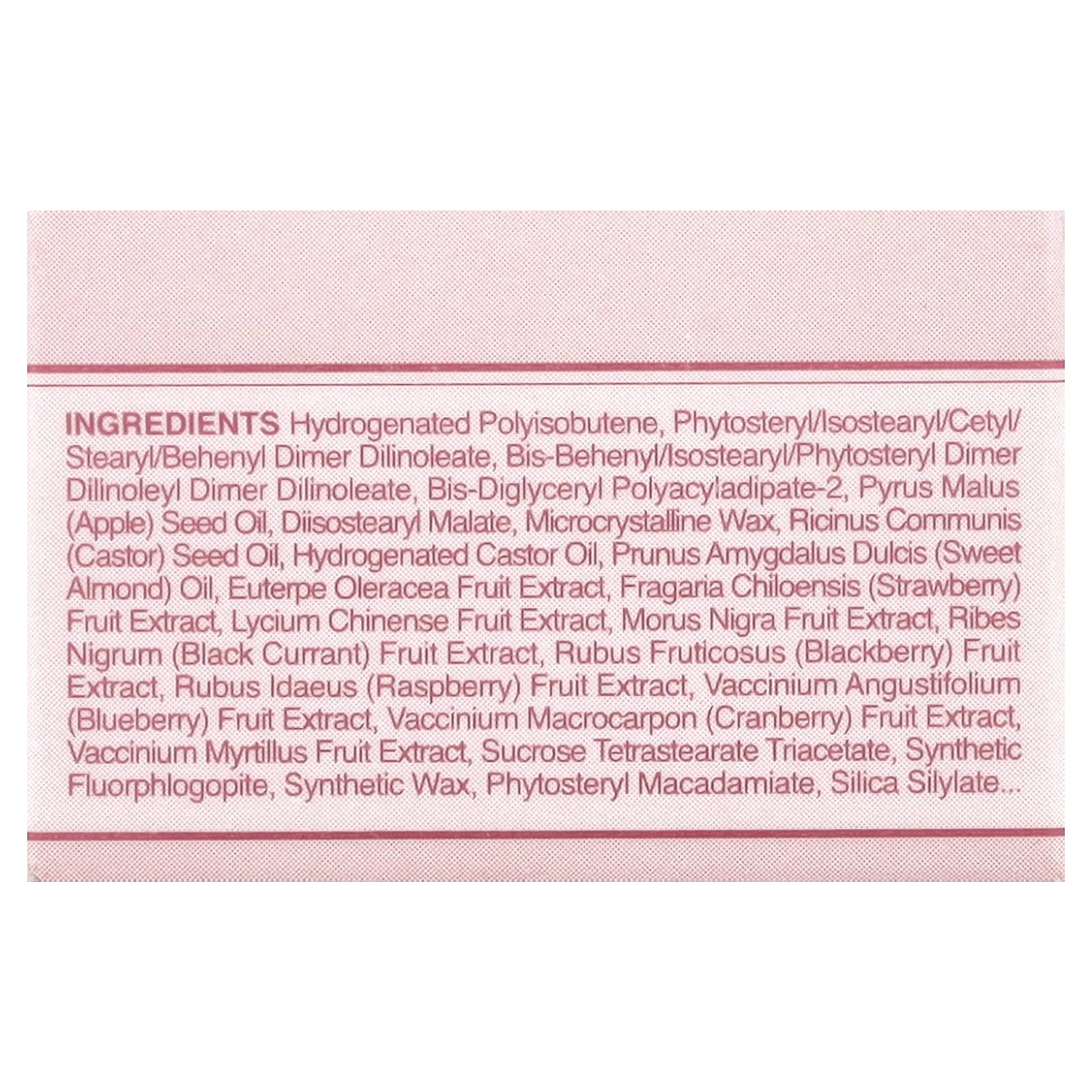 Poli-isobutileno hidrogenado, fitoesterol/isoestearil/cetil/estearil/behenyl dimer dilinoleate, bis-behenyl/isostearyl/phytosteryl dimer dilinoleyl dimer dilinoleate, bis-diglyceryl polyacyladipate-2, óleo da semente de Pyrus malus (maçã), diisostearyl malate, cera microcristalina, óleo da semente de Ricinus communis (rícino), óleo de rícino hidrogenado, óleo de Prunus amygdalus dulcis (amêndoa doce), extrato do fruto de Euterpe oleracea, extrato da fruta de Fragaria chiloensis (morango), extrato da fruta de Lycium chinense, extrato da fruta de Morus nigra, extrato da fruta de Ribes nigrum (groselha negra), extrato da fruta de Rubus fruticosus (amora), extrato da fruta de Rubus idaeus (framboesa), extrato da fruta de mirtilo de Vaccinium angustifolium), extrato da fruta de Vaccinium macrocarpon (cranberry), extrato da fruta de Vaccinium myrtillus, sucrose tetrastearate triacetate, synthetic fluorphlogopite, cera sintética, phytosteryl macadamiate, sililato de sílica, copolímero de etileno/propileno, polyglyceryl-2 triisostearate, caprylyl glycol, caprilato de glicerila, polyglyceryl-2 diisostearate, água, butilenoglicol, ethylhexylglycerin, fenoxietanol, fragrância (perfume) álcool benzílico, limoneno, dióxido de titânio (CI 77891), amarelo crepúsculo laca de alumínio (CI 15985), vermelho 7 laca de cálcio (CI 15850), vermelho 27 (CI 45410).