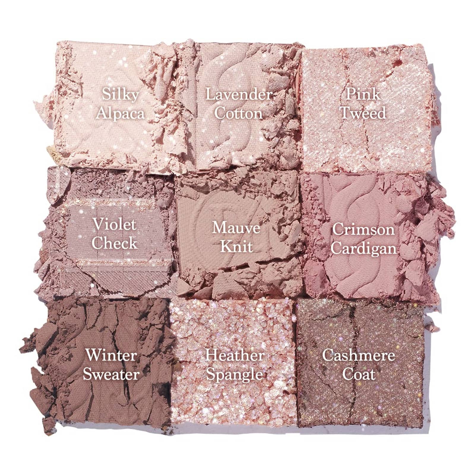 Tweed Rosa — Mica (CI 77019), talco, borosilicato de alumínio de cálcio, dimeticona, dióxido de titânio (CI 77891), fluoroflogopita sintética, laurato de hexilo, dietethylhexanoate de neopentilglicol, estearato de magnésio, dimethicone/vinyl, crospolímero de dimeticona, hexahidroxiestearato/hexaestearato/hexarosinato de dipentaeritritol, caprylyl glycol, caprilato de glicerila, vermelho óxido de ferro (CI 77491), ethylhexylglycerin, óxido de estanho, CI 15850:1, ultramarinos (CI 77007), tocoferol.