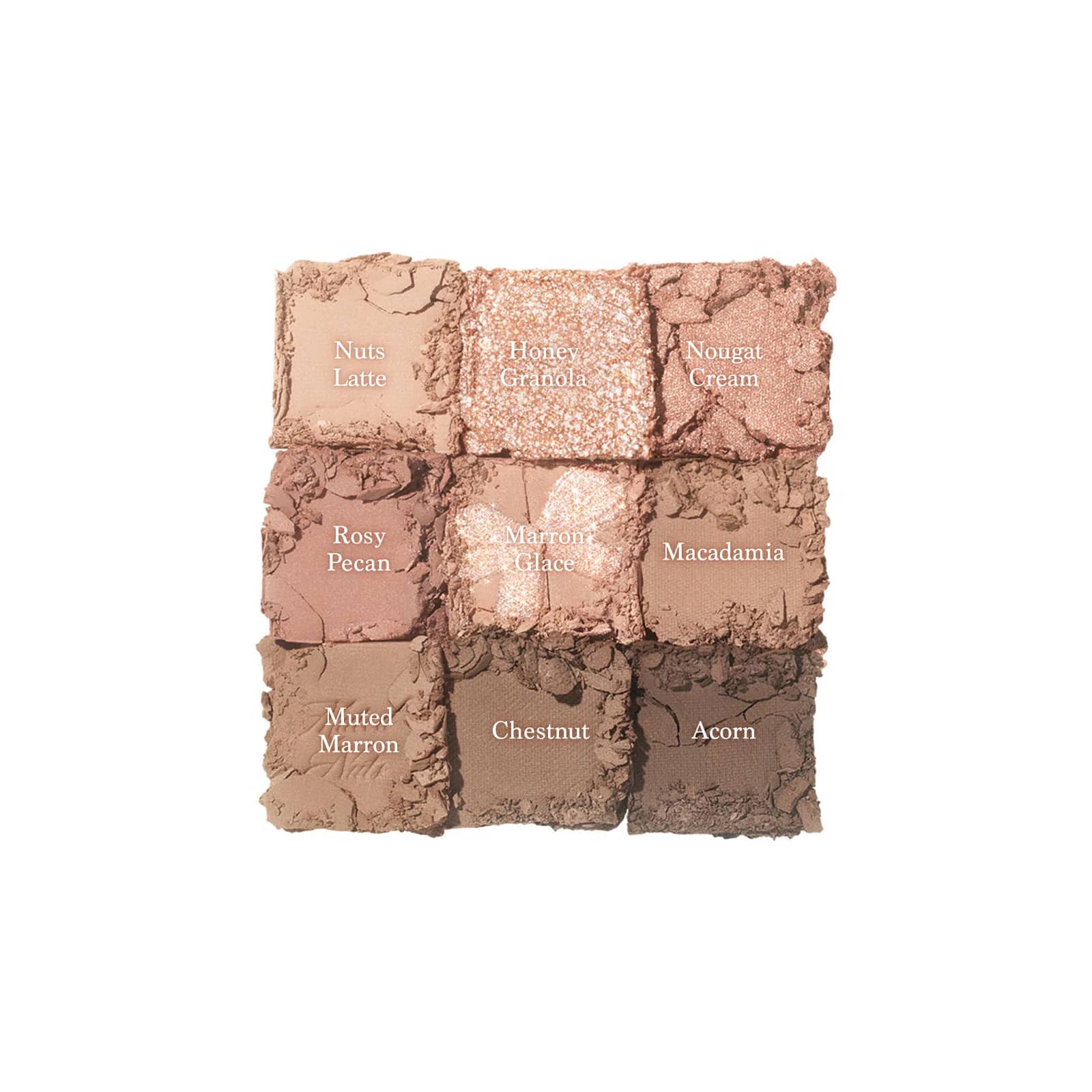 Pecã rosado: Talco, mica (CI 77019), synthetic fluorphlogopite, sílica, nitreto de boro, caprylic/capric triglyceride, manganese violet (CI 77742), dióxido de titânio (CI 77891), malato de disostearila, polymethylsilsesquioxane, óxidos de ferro (CI 77491), óleo da semente de Macadamia ternifolia, manteiga da semente de Shorea Robusta, methylpropanediol, dimeticona, miristato de magnésio, estearato de dimeticonol, propanediol, caulim, triethoxycaprylylsilane, hidróxido de alumínio, meticona, maltodextrina, óxidos de ferro (CI 77492), óxidos de ferro (CI 77499), carmina (CI 75470), ultramarines (CI 77007), amarelo 5 laca de alumínio (CI 19140).