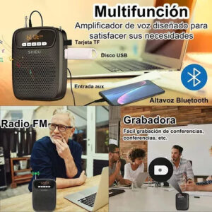 O microfone pessoal é compacto, elegante, moderno e muito fácil de transportar. Com a ajuda da presilha para cinto, este microfone portátil leve pode ser facilmente transportado pela cintura ou pescoço. O pequeno amplificador de voz é equipado com microfones de ouvido de alto desempenho.