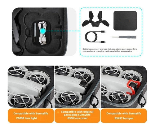 O pacote pode armazenar corpo neo, bateria de mordomo, 4 baterias (incluindo 1 no corpo e 3 no mordomo), bastão de controle cruzado 3, óculos de vôo N3, bem como filtros Sunnylife, hélices sobressalentes, chaves de fenda, cabos de carregamento e. outros acessórios.