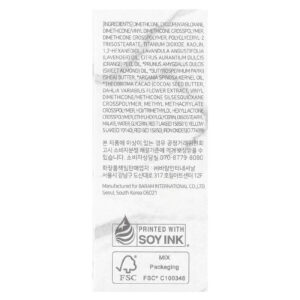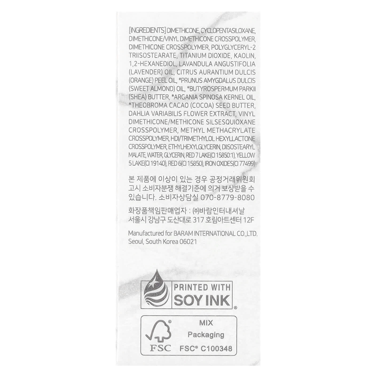 Dimeticona, ciclopentasiloxano, dimethicone/vinyl dimethicone crosspolymer, crospolímero de dimeticona, polyglyceryl-2 triisostearate, dióxido de titânio, caulim, 1,2-hexanediol, óleo de Lavandula angustifolia (lavanda), óleo da casca de Citrus aurantium dulcis (laranja), *óleo de Prunus amygdalus dulcis (amêndoa doce), *manteiga de Butyrospermum parkii (karité), *óleo do grão de Argania spinosa, *manteiga da semente de Theobroma cacao (cacau), extrato da flor de Dahlia variabilis, vinyl dimethicone/methicone silsesquioxane crosspolymer, copolímero de dimetacrilato de etilenoglicol e metacrilato de metila, hdi/trimethylol hexyllactone crosspolymer, ethylhexylglycerin, água de malato de diisoestearílico, glicerina, vermelho 7 laca de alumínio (CI 15850:1), amarelo crepúsculo laca de alumínio (CI 19140), vermelho 6 (CI 15850), óxidos de ferro (CI 77499).