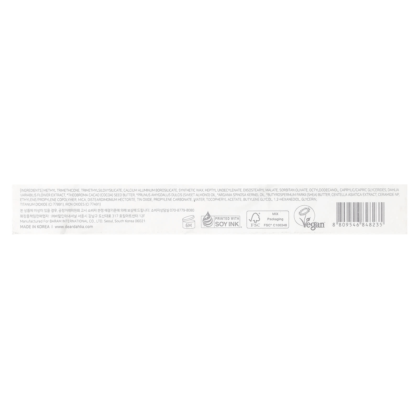 Metiltrimeticona, trimethylsiloxysilicate, calcium aluminum borosilicate, cera sintética, heptilundecilenato, diisostearyl malate, sorbitan olivate, octildodecanol, caprylic/capric glyceride, extrato da flor de Dahlia variabilis, *manteiga da semente de Theobroma cacao (cacau), *óleo de Prunus amygdalus dulcis (amêndoa doce), *óleo do grão de Argania spinosa, *manteiga de Butyrospermum parkii (karité), extrato de Centella asiatica, ceramida NP, copolímero de etileno/propileno, mica, disteardimonium hectorite, óxido de estanho, carbonato de propileno, água, acetato de tocoferol, butilenoglicol, 1,2-hexanediol, glicerina, dióxido de titânio (CI 77891), óxidos de ferro (CI 77491).