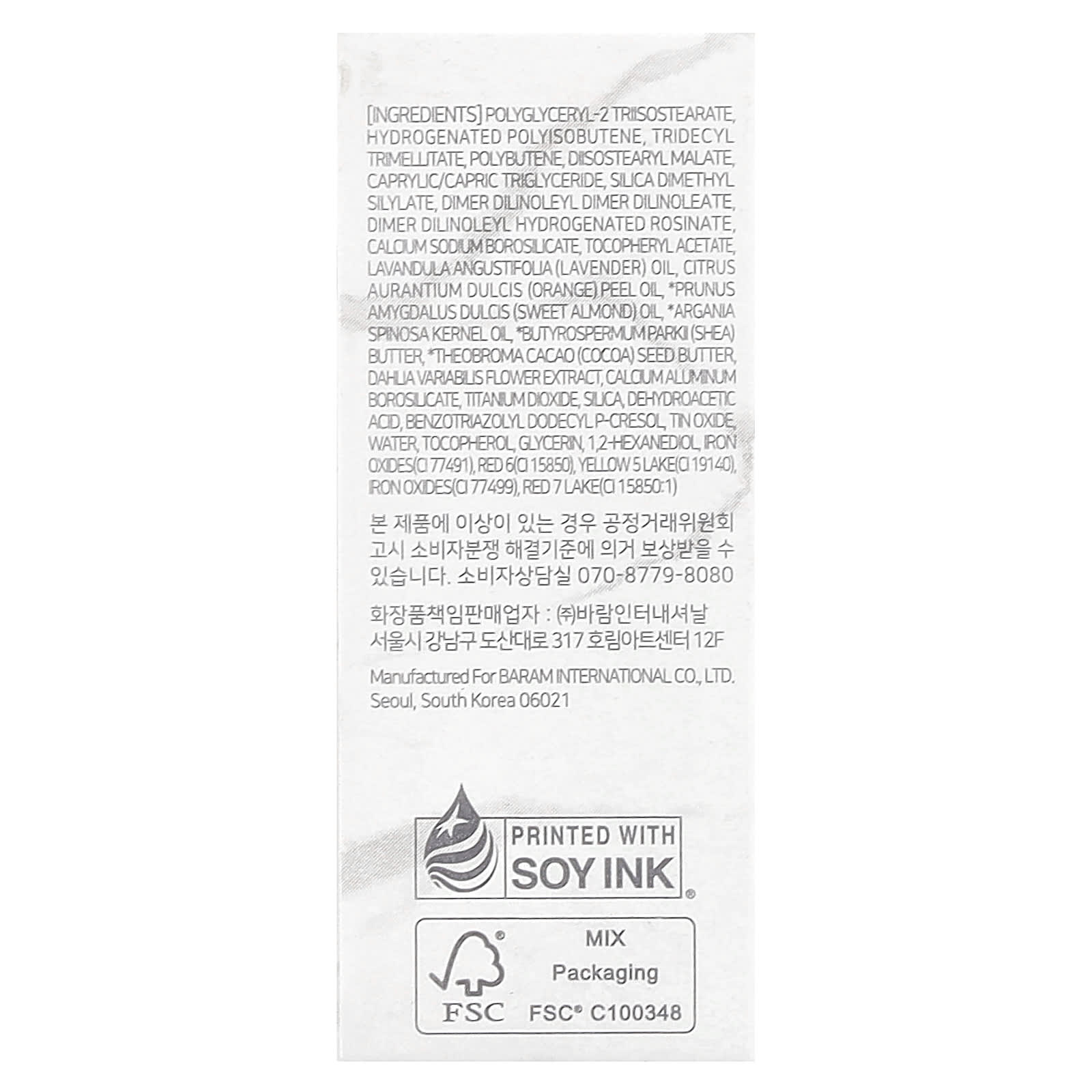 Triisostearate de poliglicerila-2, poliisobuteno hidrogenado, tridecyl trimellitate, polybutene, diisostearyl malate, caprylic/capric triglyceride, silica dimethyl silylate, dimer dilinoleyl dimer dilinoleate, dimer dilinoleyl, rosinato hidrogenado, caloum sodium borosilicate, acetato de tocoferol, óleo de Lavandula angustifolia (lavanda), óleo da casca de Citrus aurantium dulcis (laranja), *óleo de Prunus amygdalus dulcis (amêndoa doce), *óleo do grão de Argania spinosa, *manteiga de Butyrospermum parki (karité), *manteiga da semente de Theobroma cacao (cacau), extrato da flor de Dahlia variabilis, calcium aluminum borosilicate, dióxido de titânio, sílica, dehydroacetic acid, benzotriazolil dodecyl p-cresol, óxido de estanho, água, tocoferol, glicerina, 1,2-hexanediol, óxidos de ferro (CI 77491), vermelho 6(0 15850), amarelo crepúsculo laca de alumínio (0 19140) óxidos de ferro (CI 77499), vermelho 7 laca de alumínio (CI 15850:1).