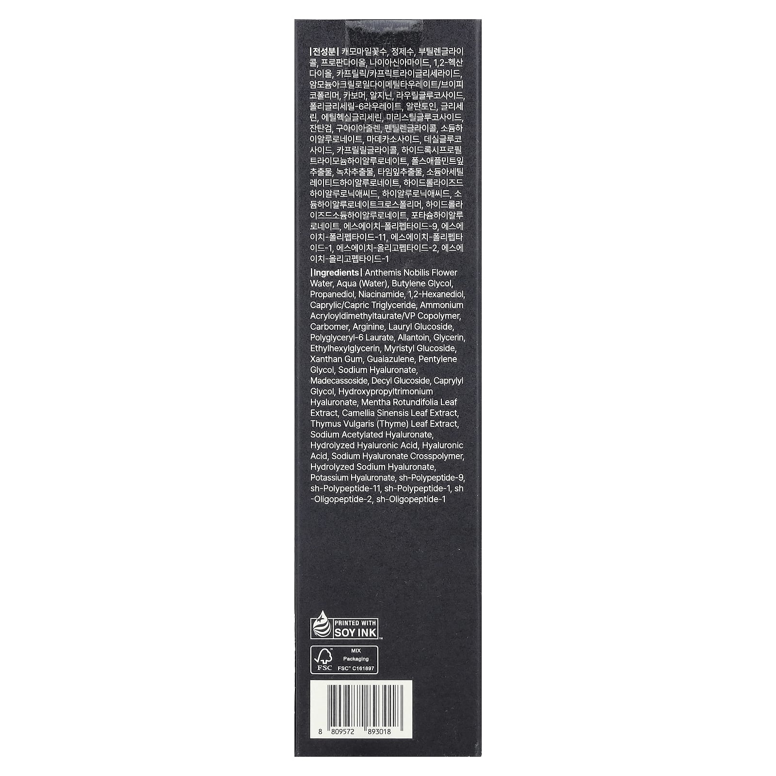 Água da flor de Anthemis nobilis, aqua (água), butilenoglicol, propanediol, nicotinamida, 1,2-hexanediol, caprylic/capric triglyceride, ammonium acryloyldimethyltaurate/vp copolymer, carbômero, arginina, lauryl glucoside, laurato de poliglicerila-6, alantoína, glicerina, ethylhexylglycerin, myristyl glucoside, goma xantana, guaiazuleno, pentilenoglicol, hialuronato de sódio, madecassoside, decyl glucoside, caprylyl glycol, hydroxypropyltrimonium hyaluronate, extrato da folha de Mentha rotundifolia, extrato da folha de Camellia sinensis, extrato da folha de Thymus vulgaris (tomilho), sodium acetylated hyaluronate, ácido hialurônico hidrolisado, ácido hialurônico, sodium hyaluronate crosspolymer, hialuronato de sódio hidrolisado, hialuronato de potássio, sh-polypeptide-9, sh-polipeptídeo-11, sh-polipeptídeo-1, sh-oligopeptide-2, sh-oligopeptídeo-1.