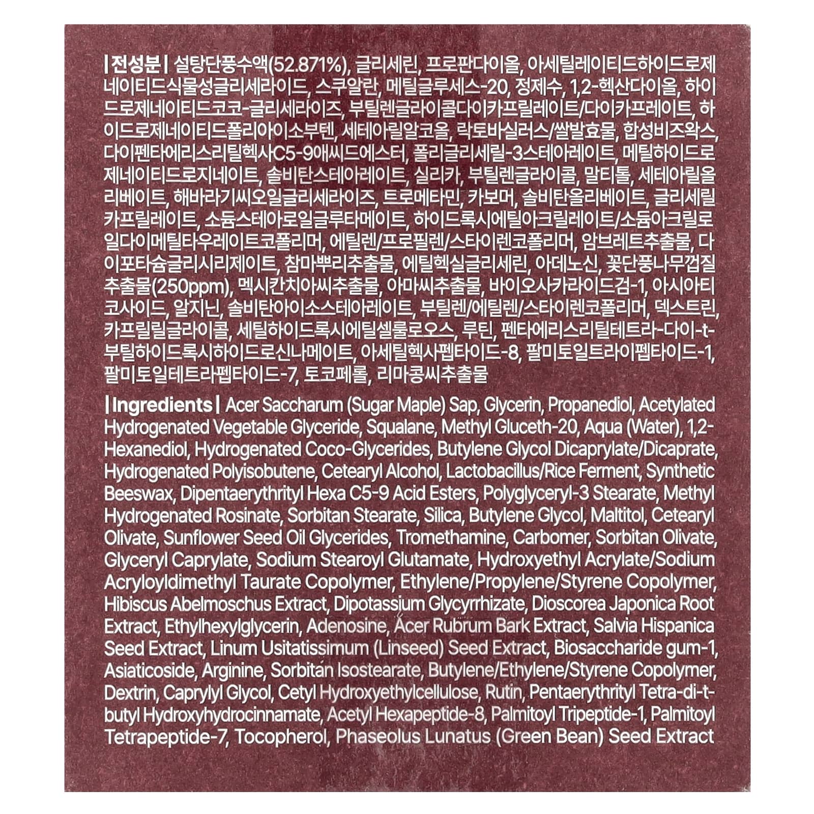 Seiva de Acer saccharum (bordo-açucareiro), glicerina, propanediol, glicerídeo vegetal hidrogenado acetilado, esqualano, methyl gluceth-20, aqua (água), 1,2-hexanediol, glicerídeo de coco hidrogenado, butylene glycol dicaprylate/dicaprate, poliisobuteno hidrogenado, álcool cetoestearílico, lactobacillus/fermento de arroz, cera de abelha sintética, dipentaerythrityl hexa c5-9 acid esters, monoestearato de poliglicerila-3, methyl hydrogenated rosinate, estearato de sorbitana, sílica, butilenoglicol, maltitol, cetearyl olivate, glicerídeos de óleo da semente de girassol, trometamol, carbômero, sorbitan olivate, caprilato de glicerila, sodium stearoyl glutamate, copolímero de acriloildimetiltaurato de sódio e acrilato de hidroxietila, ethylene/propylene/styrene copolymer, extrato de Hibiscus abelmoschus, dipotassium glycyrrhizate, extrato da raiz de Discorea japonica, ethylhexylglycerin, adenosina, extrato da casca de Acer rubrum, extrato da semente de Salvia hispanica, extrato da semente de Linum usitatissimum (linhaça), goma de biossacarídeo-1, asiaticosídeo, arginina, isoestearato de sorbitana, copolímero de butileno/etileno/estireno, dextrina, caprylyl glycol, cetyl hydroxyethylcellulose, rutina, pentaeritritol tetra-di-t-butyl hydroxyhydrocinnamate, acetyl hexapeptide-8, palmitoyl tripeptide-1, palmitoyl tetrapeptide-7, tocoferol, extrato da semente de Phaseolus unatus (feijão verde).