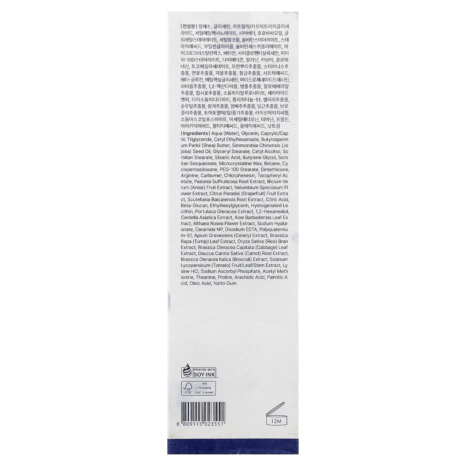 Aqua (água), glicerina, caprylic/capric triglyceride, etilcaproato de cetila, manteiga de Butyrospermum parkii (karité), óleo da semente de Simmondsia chinensis (jojoba), monoestearato de glicerila, álcool cetílico, estearato de sorbitana, ácido esteárico, butilenoglicol, sesquioleato de sorbitana, cera microcristalina, betaína, ciclopentasiloxano, estearato de PEG-100, dimeticona, arginina, carbômero, clorfenesina, acetato de tocoferol, extrato de raiz de Paeonia suffruticosa, extrato da fruta de Illicium verum (anis), extrato da flor de Nelumbium speciosum, extrato da fruta de Citrus paradisi (toranja rosa), extrato da raiz de Scutellaria baicalensis, ácido cítrico, betaglucano, ethylhexylglycerin, lecitina hidrogenada, extrato de Portulaca oleracea, 1,2-hexanediol, extrato de Centella asiatica, extrato da folha de Aloe barbadensis, extrato da flor de Althaea rosea, hialuronato de sódio, ceramida NP, edetato dissódico, poliquatérnio-51, extrato de Apium graveolens (aipo), extrato da folha de Brassica rapa (nabo), extrato do farelo de Oryza sativa (arroz), extrato da folha de Brassica oleracea capitata (repolho), extrato da raiz de Daucus carota sativa (cenoura), extrato de Brassica oleracea italica (brócolis), extrato da fruta/folha/caule de Solanum lycopersicum (tomate), cloridrato de lisina, sodium ascorbyl phosphate, acetilmetionina, theanine, prolina, ácido eicosanoico, ácido palmítico, ácido oleico, goma natto.