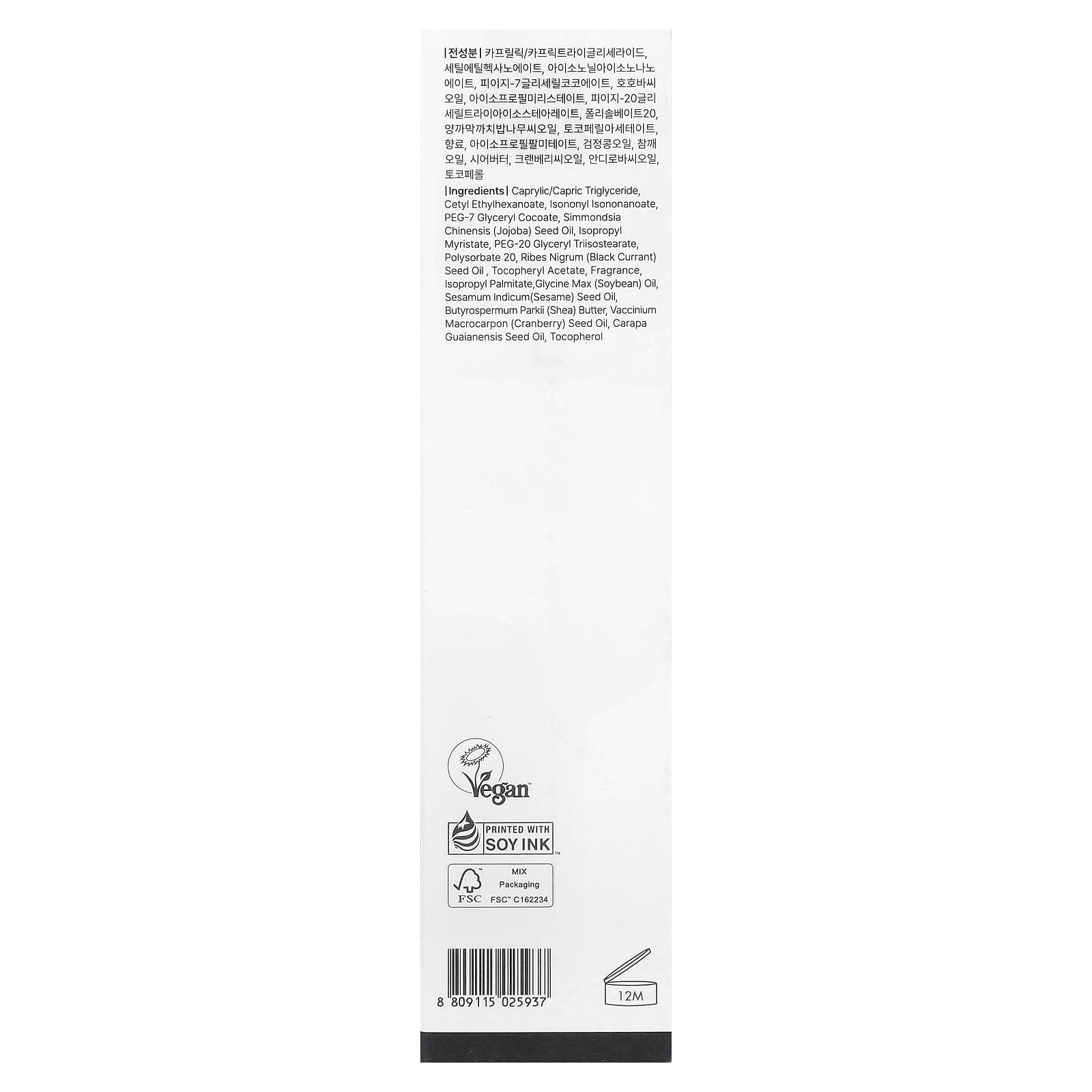 Caprylic/capric triglyceride, etilcaproato de cetila, isononyl isononanoate, peg-7 glyceryl cocoate, miristato de isopropila, óleo da semente de Simmondsia chinensis (jojoba), óleo de Glycine soja (soja), óleo da semente de Sesamum indicum (gergelim), óleo da semente de Ribes nigrum (groselha negra), acetato de racealfatocoferol, peg-20 glyceryl triisostearate, polissorbato 20, fragrância, Butyrospermum parkii (manteiga de karité), óleo da semente de carapa guaianensis, óleo da semente de vaccinium macrocarpon (cranberry).