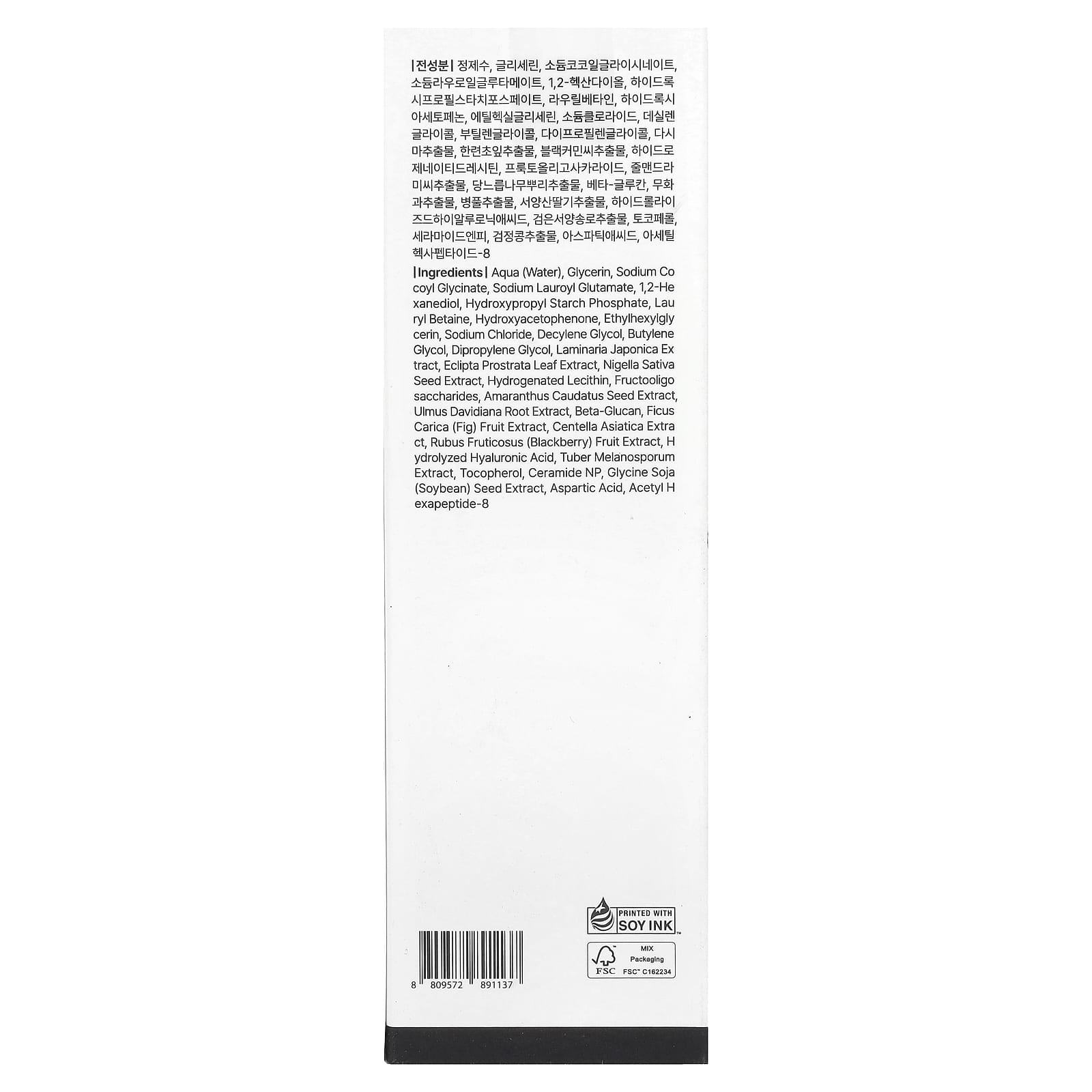 Água, glicerina, sodium cocoyl glycinate, sodium lauroyl glutamate, 1,2-hexanediol, fosfato de hidroxipropilamido, lauryl betaine, hydroxyacetophenone, ethylhexylglycerin, cloreto de sódio, decilenoglicol, butylene glycol, dimetildietilenoglicol, extrato de Laminaria japonica, extrato da folha de Eclipta prostrata, extrato da semente de nigella sativa, hydrogenated lecithin, fruto-oligossacarídeos, extrato da semente de amaranto caudatus, extrato da raiz de Ulmus davidiana, beta-glucan, extrato da fruta de Ficus carica (figo), extrato de Centella asiatica, extrato da fruta Rubus fruticosus (amora), ácido hialurônico hidrolisado, extrato de Tuber melanosporum, tocoferol, ceramide NP, extrato da semente de Glycine soja (soja), ácido aspártico, acetil hexapeptídeo-8.