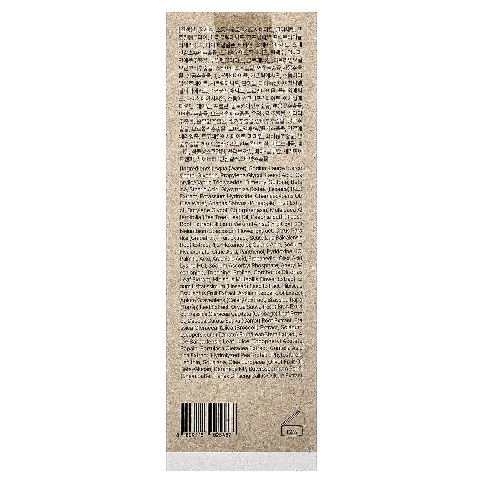 Aqua (água), sodium lauroyl sarcosinate, glicerina, propilenoglicol, ácido láurico, caprylic/capric triglyceride, dimetilsulfona, betaína, ácido esteárico, extrato da raiz de Glycyrrhiza glabra (alcaçuz), hidróxido de potássio, água de Chamaecyparis obtusa, extrato da fruta de Ananas sativus (abacaxi), butilenoglicol, clorfenesina, óleo da folha de Melaleuca alternifolia (melaleuca), extrato de raiz de Paeonia suffruticosa, extrato da fruta de Illicium verum (anis), extrato da flor de Nelumbium speciosum, extrato da fruta de Citrus paradisi (toranja rosa), extrato da raiz de Scutellaria baicalensis, 1,2-hexanediol, ácido cáprico, hialuronato de sódio, ácido cítrico, pantenol, cloridrato de piridoxina, ácido palmítico, ácido eicosanoico, propanediol, ácido oleico, cloridrato de lisina, sodium ascorbyl phosphate, acetilmetionina, theanine, prolina, extrato da folha de Corchorus olitorius, extrato da flor de Hibiscus mudabilis, extrato da semente de Linum usitatissimum (linhaça), extrato da fruta de Hibiscus esculentus, extrato da raiz de Arctium lappa, extrato de Apium graveolens (aipo), extrato da folha de Brassica rapa (nabo), extrato do farelo de Oryza sativa (arroz), extrato da folha de Brassica oleracea capitata (repolho), extrato da raiz de Daucus carota sativa (cenoura), extrato de Brassica oleracea italica (brócolis), extrato da fruta/folha/caule de Solanum lycopersicum (tomate), suco da folha de Aloe barbadensis, acetato de tocoferol, papaína, extrato de Portulaca oleracea, extrato de Centella asiatica, proteína de ervilha hidrolisada, fitoesteróis, lecitina, esqualano, óleo da fruta de Olea europaea (azeitona), betaglucano, ceramida NP, manteiga de Butyrospermum parkii (karité), extrato da cultura de calosidade de Panax ginseng.