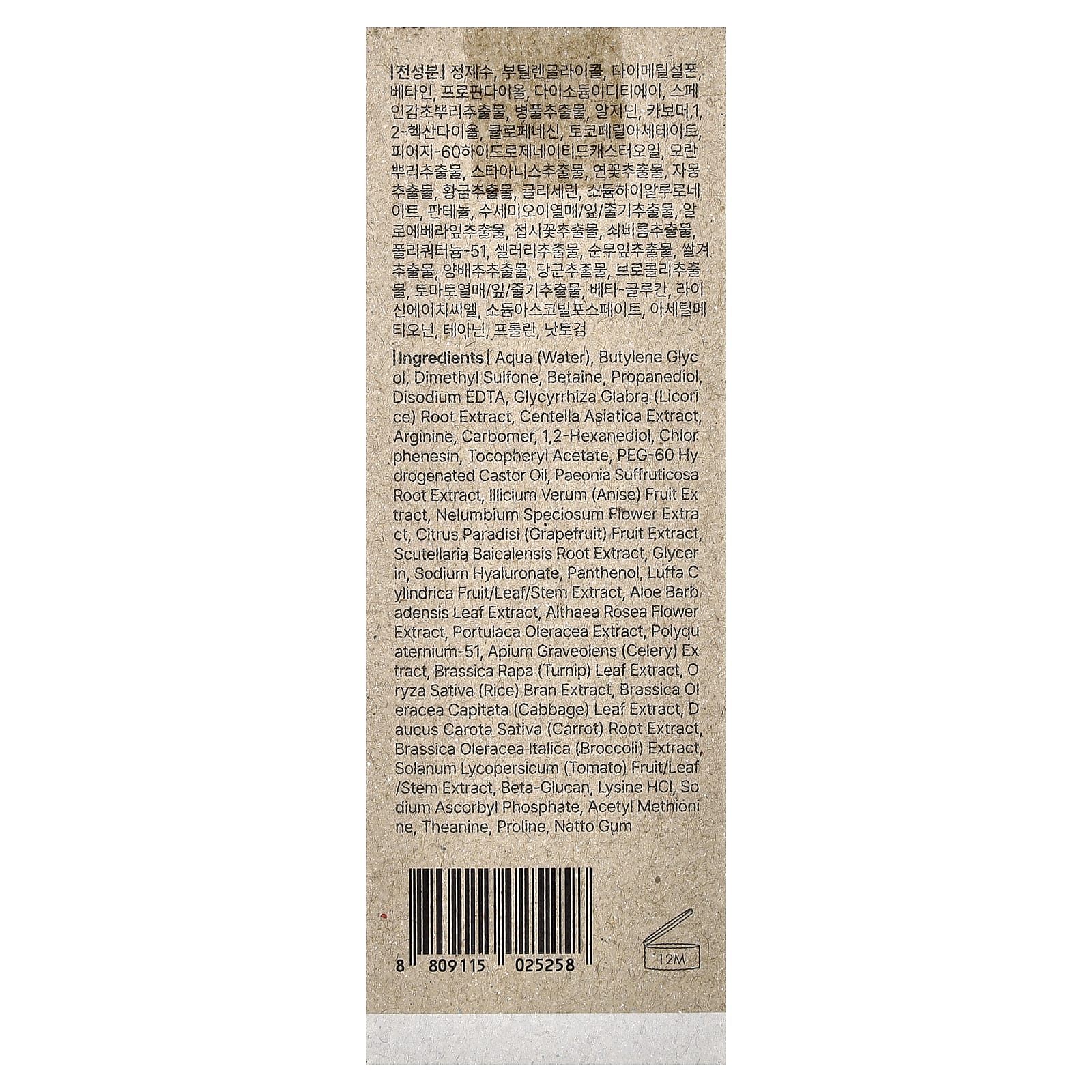 Água, butilenoglicol, dimetilsulfona, betaína, propanediol, edetato dissódico, extrato da raiz de Glycyrrhiza glabra (alcaçuz), extrato de Centella asiatica, arginina, carbômero, 1,2-hexanediol, clorfenesina, acetato de tocoferol, óleo de rícino hidrogenado peg-60, extrato de raiz de Paeonia suffruticosa, extrato da fruta de Illicium verum (anis), extrato da flor de Nelumbium speciosum, extrato da fruta de Citrus paradisi (toranja rosa), extrato da raiz de Scutellaria baicalensis, glicerina, hialuronato de sódio, pantenol, extrato de fruta/folha/caule de Luffa cylindrica, extrato da folha de Aloe barbadensis, extrato da flor de Althaea rosea, extrato de Portulaca oleracea, poliquatérnio-51, extrato de Apium graveolens (aipo), extrato da folha de Brassica rapa (nabo), extrato do farelo de Oryza sativa (arroz), extrato da folha de Brassica oleracea capitata (repolho), extrato da raiz de Daucus carota sativa (cenoura), extrato de Brassica oleracea italica (brócolis), extrato da fruta/folha/caule de Solanum lycopersicum (tomate), betaglucano, lisina hcl, sodium ascorbyl phosphate, acetilmetionina, theanine, prolina, goma natto.