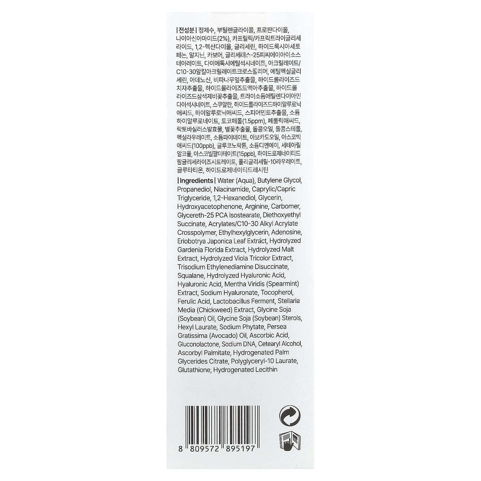 Água, butilenoglicol, propanediol, nicotinamida, caprylic/capric triglyceride, 1,2-hexanediol, glicerina, hydroxyacetophenone, arginina, carbômero, isostearato de glicerila-25 pca, succinato de dietoxietil, acrylates/c10-30 alkyl acrylate crosspolymer, ethylhexylglycerin, adenosina, extrato da folha de Eriobotrya japonica, extrato de Gardenia florida hidrolisado, extrato de malte hidrolisado, extrato de Viola tricolor hidrolisado, trisodium ethylenediamine disuccinate, esqualano, ácido hialurônico hidrolisado, ácido hialurônico, extrato de Mentha viridis (hortelã), hialuronato de sódio, tocoferol, ferulic acid, fermento de lactobacillus, extrato de Stellaria media (Morugem), óleo de Glycine soja (soja), esteróis de glicina de soja (soja), hexyl laurate, fitato de sódio, óleo de Persea gratissima (abacate), ácido ascórbico, gluconolactone, DNA de sódio, álcool cetoestearílico, palmitato de ascorbila, citrato de glicerídeos de palma hidrogenado, polyglyceryl-10 laurate, glutationa, lecitina hidrogenada.