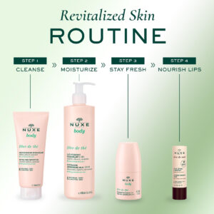 Apresentando o desodorante NUXE Rve de The Fresh-Feel: sua melhor opção para proteção duradoura e frescor revigorante que dura o dia todo! Nosso desodorante roll-on apresenta tecnologia inteligente, utilizando um trio de ingredientes ativos que se adaptam às necessidades da sua pele, prevenindo odores de forma eficaz e fornecendo proteção 24 horas*. Este desodorante refrescante é feito com 97% de ingredientes de origem natural e é orgulhosamente produzido na França. Sua textura fluida, infundida com um aroma revigorante de chá verde, é rapidamente absorvida pela pele sem deixar nenhum resíduo pegajoso, além de proporcionar um efeito refrescante na aplicação. Projetado para todos os tipos de pele, o desodorante NUXE Rve de Th não deixa riscos nas roupas e garante que você permaneça fresco e confiante de manhã à noite. Aproveite os benefícios de um desodorante de luxo que mantém você se sentindo fresco e fabuloso durante todo o dia! – Proteção duradoura de 24 horas* com aplicação contínua refrescante – Infundida com um aroma revitalizante de chá verde – 97% de ingredientes de origem natural, fabricados na França – A tecnologia inteligente se adapta às necessidades da pele, prevenindo odores de forma eficaz – Fluido não pegajoso e de rápida absorção, sem riscos nas roupas