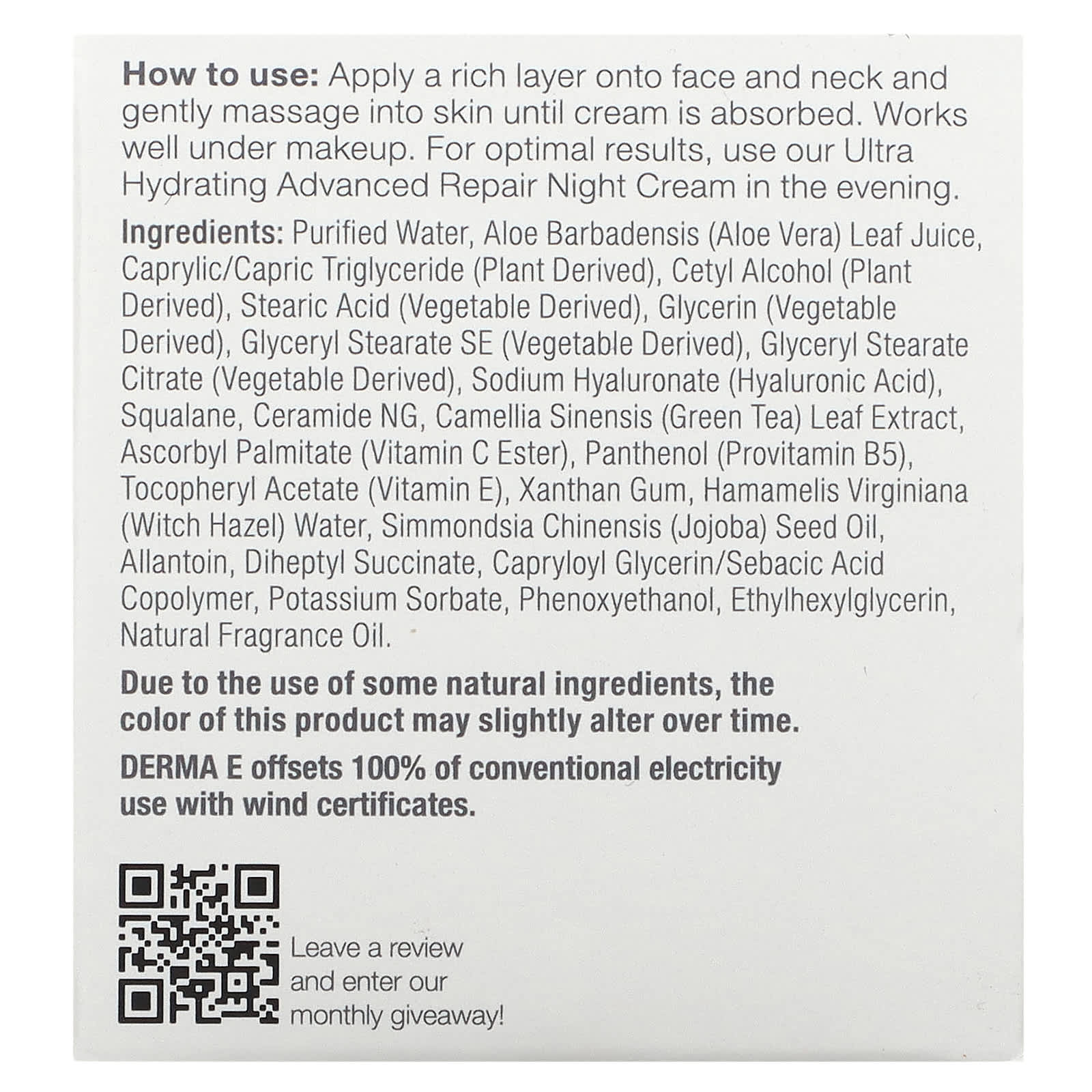 Água purificada, triglicérido caprílico / caprílico (derivado de plantas), glicerina (derivada de vegetais), ácido esteárico (derivado de vegetais), estearato de glicerilo, álcool cetílico (derivado de plantas), citrato de estearato de glicerilo (derivado de vegetais), hialuronato de sódio (ácido hialurônico; actimoista bio-10, palmitato de ascorbilo (éster de vitamina C), pantenol (provitamina B5), acetato de tocoferilo (vitamina E), goma xantana, palmitato de retinilo (vitamina A), extrato hamamelis virginiana (avelã), aloe barbadensis orgânico (aloe vera ) extracto de gel *, extracto foliar orgânico de camélia sinensis (chá verde) *, óleo de semente orgânico simmondsia chinensis (jojoba) *, alantoína, polissorbato 20, dimeticona, dióxido de titânio, sorbato de potássio, fenoxietanol, etilhexilglicerina, óleos de fragrância natural.
