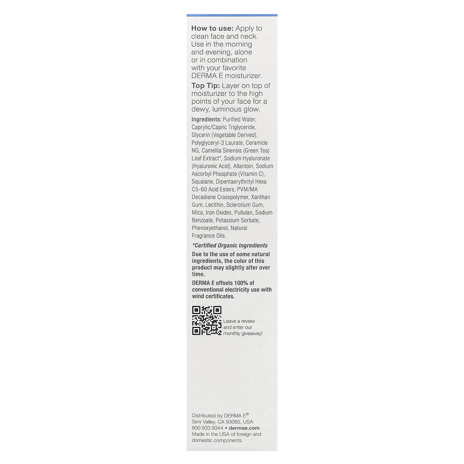 Aplique sobre o rosto e pescoço limpos. Use de manhã e à noite, puro ou com seu hidratante favorito da Derma E.