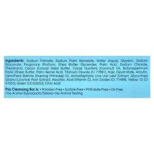 Sodium palmate, sodium palm kernelate, água (aqua), glicerina, gliconato de sódio, fragrância (perfume), glicerídeos de manteiga de karité, palm acid, cloreto de sódio, manteiga da semente de Theobroma cacoa (cacau), óleo de Cocos nucifera (coco), manteiga de Butyrospermum parkii (karité), palm kernel acid, dióxido de titânio (CI 77891), dipalmitato kojic, arbutin, óleo de Oenothera biennis (prímula), extrato da folha de Arctostaphylos uva ursi, extrato da raiz de Glycyrrhiza glabra (alcaçuz), ácido ascórbico (vitamina C), óxidos de ferro (CI 77499), amarelo 10 (CI 47005), verde 3 (CI 42053), ácido cítrico.
