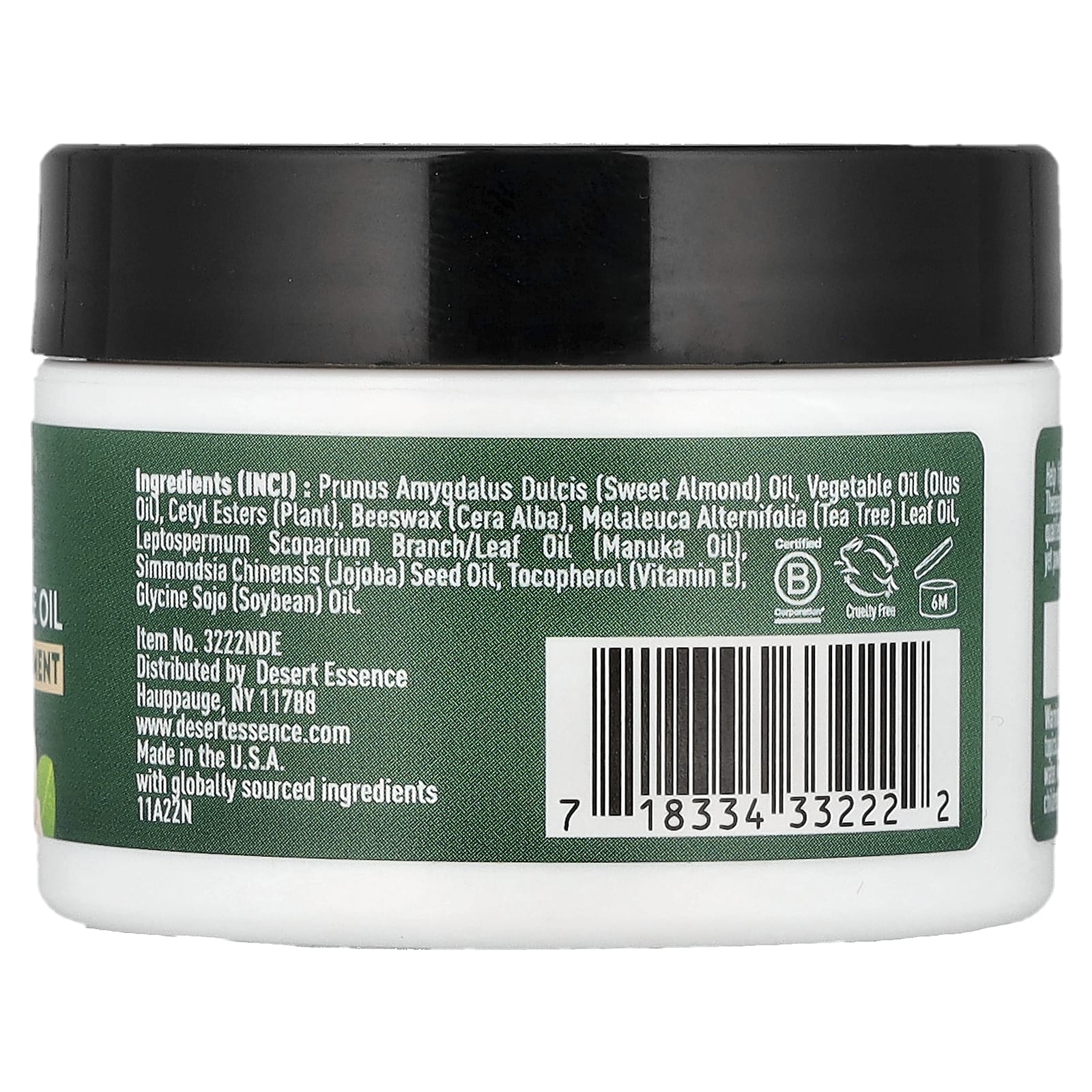 Óleo de Prunus amygdalus dulcis (amêndoa doce), óleo vegetal (óleo do Olus), ésteres cetílicos (planta), cera de abelha (cera alba), óleo da folha de Melaleuca alternifolia (melaleuca), óleo da folha/raiz de Leptospermum scoparium (óleo de Manuka), óleo da semente de Simmondsia chinensis (jojoba), tocoferol (vitamina E) óleo de glicina de soja (soja).
