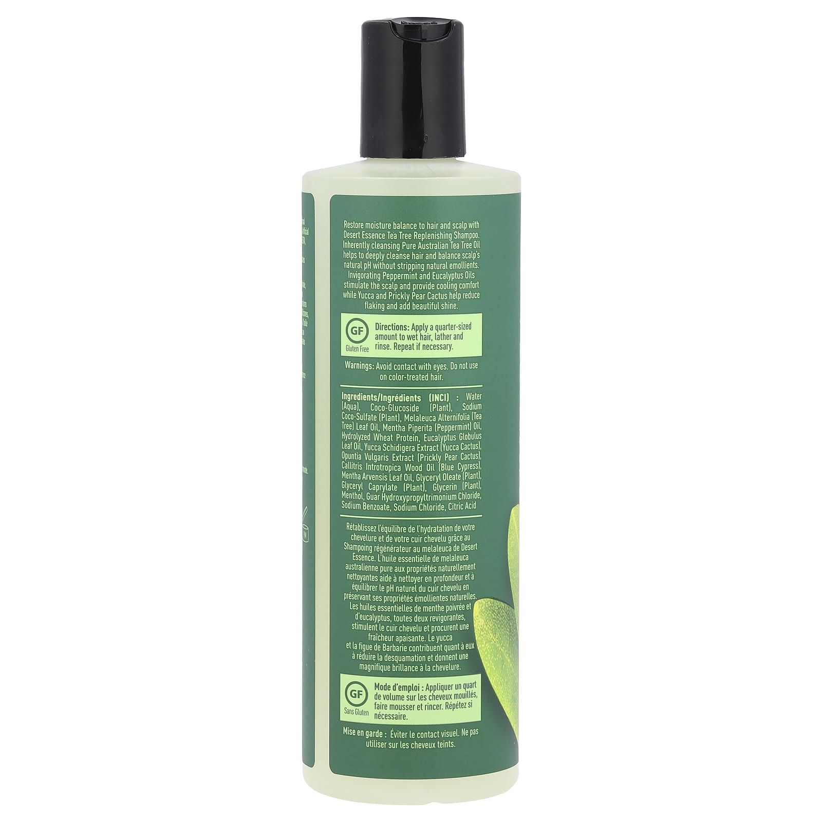 Água (aqua), coco-glucoside sodium coco sulfate (planta), Melaleuca alternifolia (chá [planta), óleo da folha de árvore), óleo de Mentha piperita (hortelã-pimenta), proteína de trigo hidrolisada, óleo da folha de Eucalypto globulus, extrato de Yucca schidigera (cacto yucca), extrato de opuntia vulgaris (cacto de opúncia), óleo da madeira de Calitris introtropica (cipreste azul), óleo da folha de Mentha arvensis, glycerol oleate (planta), glyceryl caprylate (planta), glicerina (planta), mentol, guar hydroxypropyltrimonium chloride, benzoato de sódio, cloreto de sódio, ácido cítrico.