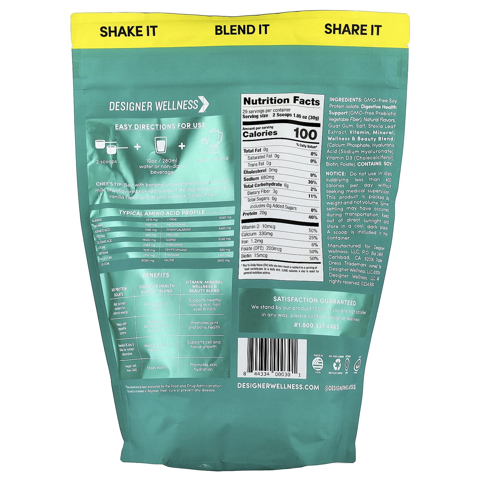 isolado proteico de soja não OGM, auxílio à saúde digestiva (fibra vegetal prebiótica não OGM), sabores naturais, goma guar, sal, extrato da folha de estévia, vitamina, minerais, bem-estar e bem-estar mistura de beleza: (fosfato de cálcio, ácido hialurônico (hialuronato de sódio), vitamina D3 (colecalciferol), biotina, folato).