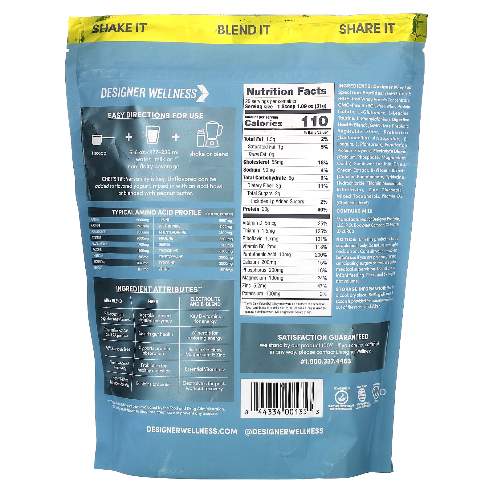 100% de proteína de whey com um espectro completo de peptídeos, além de enzimas digestivas baseadas em vegetais para apoiar a absorção de proteínas, vitaminas B para ajudar a converter proteínas em energia utilizável, cálcio, vitamina D, fósforo, magnésio, zinco, probióticos e eletrólitos para pós- recuperação de exercícios.