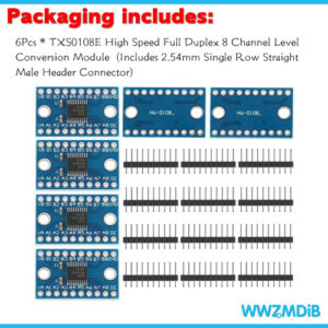 Módulo de conversão de nível de 8 canais WwZMDib 6Pcs TXS0108E Full Duplex de alta velocidade Conversor de tensão bidirecional de 8 bits O microcontrolador de 5V e o módulo de 3,3V fornecem recursos de comunicação bidirecional Tensão de suporte do terminal VCCA: 1,2 ~ 3,6V. Tensão de suporte do terminal VCCB: 1,65 ~ 5,5V. Microcontrolador de 5V usado principalmente e interface de comunicação serial de módulo de 3,3V compatível com a porta UART/IIC/SPI, fácil de conectar. Descrição: Este tradutor não inversor de 8 bits usa dois trilhos de fonte de alimentação configuráveis separados. A porta A foi projetada para rastrear o VCCA. O VCCA aceita qualquer tensão de alimentação de 3,6 V. A porta B foi projetada para rastrear o VCCB. O VCCB aceita qualquer tensão de alimentação de 5,5 V. Isso permite a tradução bidirecional de baixa tensão entre qualquer um dos nós de tensão de 2,5 V, 3,3 V e 5 V. Quando a entrada de ativação de saída (OE) está baixa, todas as saídas são colocadas no estado de alta impedância. Para garantir o estado de alta impedância durante a alimentação ou desligamento, o OE deve ser vinculado ao GND por meio de um resistor pulldown; o valor mínimo do resistor é determinado pela capacidade de fornecimento de corrente do driver. O pacote inclui: 3 unidades TXS0108E de alta velocidade Full Duplex de 8 canais. 6 unidades de cabeçalho de 8 pinos – Fornece recursos de comunicação bidirecional – Tensão de suporte do terminal VCCA: 1,2 ~ 3,6 V. – Tensão de suporte do terminal VCCB: 1,65 ~ 5,5 V. – Microcontrolador de 5 V usado principalmente e módulo de 3,3 V – Interface de comunicação serial compatível com a porta UART/IIC/SPI, fácil de conectar.