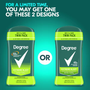 Desodorante antitranspirante Degree Men Original Protection Extreme Blast Twin Pack, 48 horas de proteção contra suor e odor para homens de 2,7 onças a 48 horas de proteção: vidas ativas precisam do desodorante antitranspirante Degree Men Extreme Blast. Este antitranspirante para homens oferece confiança com 48 horas de proteção contra suor e odor. – SINTA-SE FRESCO O DIA TODO: este desodorante antitranspirante mantém você seco com um aroma cítrico revigorante. Você se sentirá tão revigorado quanto quando começou o dia. – PRONTO PARA O QUE VEM A SEGUIR: aproveite o dia com o desodorante antitranspirante em bastão Degree Men Extreme Blast. Basta girar, deslizar e se mover. – PERFUME REVIGORANTE: mantenha-se fresco por mais tempo com este antitranspirante masculino. O desodorante antitranspirante Degree Men Extreme Blast apresenta um aroma estimulante para manter você energizado. – RECICLE COM GRAU: Além de aumentar o uso de materiais reutilizáveis, estamos facilitando a reciclagem de nossas embalagens de antitranspirante e spray seco. – ULTRAPASSE SEUS LIMITES: Na Degree, queremos inspirar a confiança de todos para que avancem mais e avancem. Estamos aqui para apoiar sua jornada com um antitranspirante para homens que se move com você.