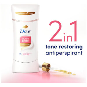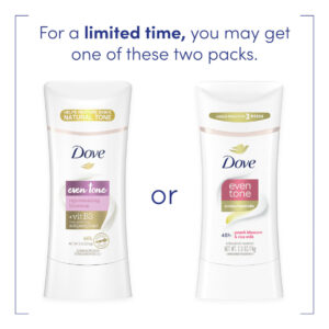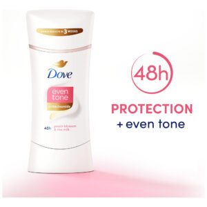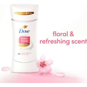 Desodorante antitranspirante Dove Even Tone Stick Peach Blossom & Rice Milk 3 unidades de 2,6 onças – Desodorante antitranspirante 2 em 1: antitranspirante restaurador de tom com proteção contra odor e suor por 48 horas – EVEN TONE: um desodorante antitranspirante que ajuda a restaurar visivelmente o tom natural da pele em apenas três semanas – COM INGREDIENTES CUIDADOSOS: uma fórmula restauradora da pele, infundida com niacina ingredientes estimulantes de inamida (vitamina B3) e ceramida para axilas mais lisas e um tom de pele mais uniforme – SMOOTH GLIDE: este desodorante antitranspirante desliza suavemente na pele e não deixa nada visível resíduo, para que você possa se vestir e ir embora – FLORAL SCENT: desodorante antitranspirante com um aroma refrescante de flor de pêssego semelhante à primavera
