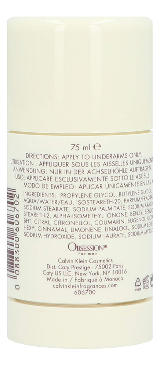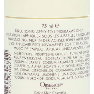 Key Features ——————– – Lightly scented deodorant stick designed for men – Unique fragrance notes include bergamot, lavender, sage, musk, and sandalwood – Alcohol-free formula ensures comfort and skin friendliness – Captures the essence of masculinity and sophistication – Ideal for daily use, providing reliable and long-lasting odor protection Fact Sheet ——————– – Brand: Calvin Klein – Product Type: Deodorant Stick – Capacity: 150 mL (5 fl oz) – Weight: 75 g (2.6 oz) – Alcohol-Free: Yes Experience the captivating scent of Calvin Klein Obsession for Men Deodorant Stick. This deodorant is crafted for the modern man who embodies confidence and charisma. The delicate blend of bergamot, lavender, sage, musk, and sandalwood creates a fragrance that is both refreshing and timeless. Perfect for day-to-day wear, this deodorant stick offers reliable protection against odor while enhancing your style. Elevate your grooming routine with this iconic scent that embodies sophistication and allure, ensuring you feel fresh and irresistible all day long. Ideal for those seeking a standout fragrance that resonates with the essence of masculinity, this deodorant is a must-have addition to your personal care collection.