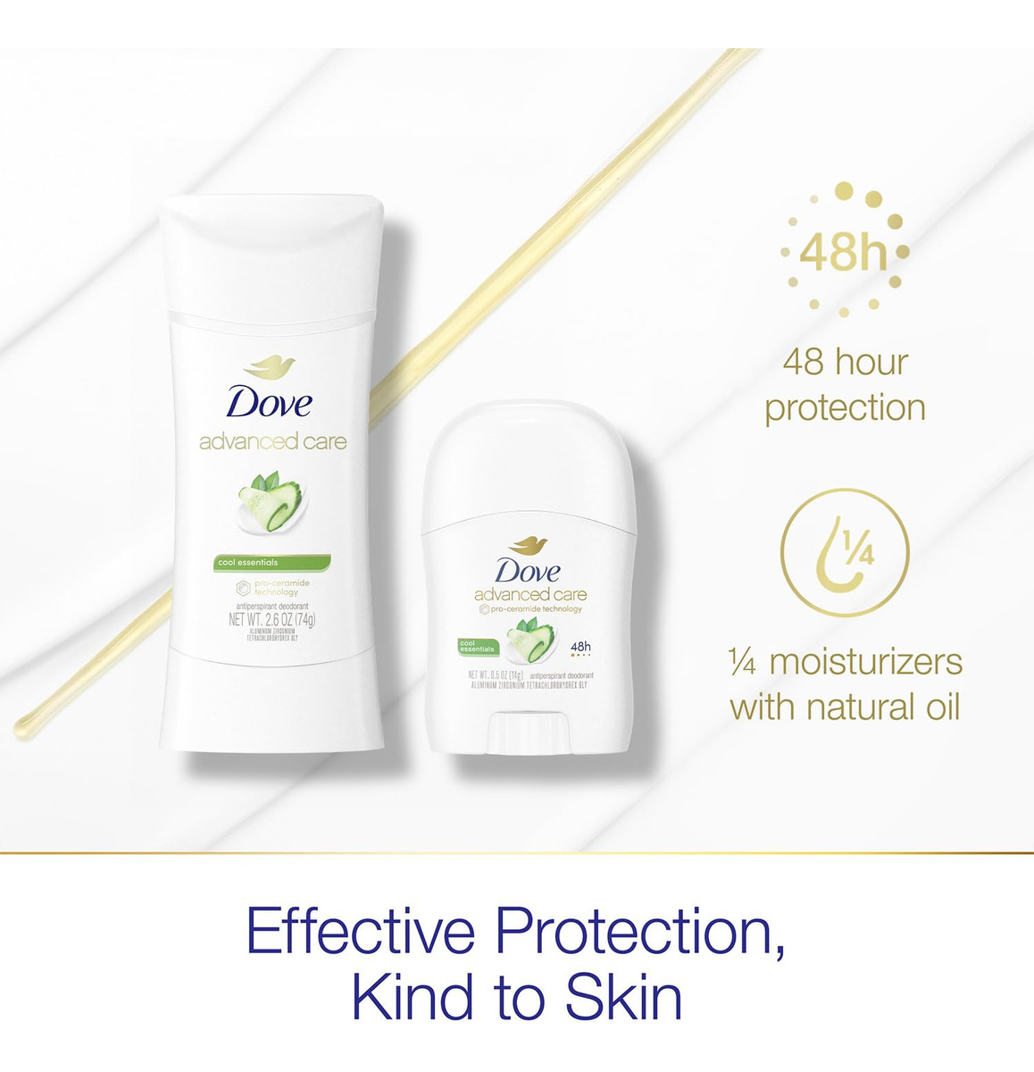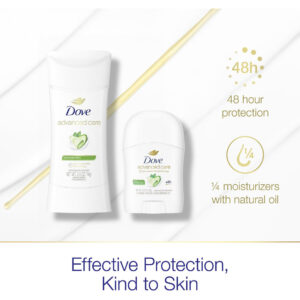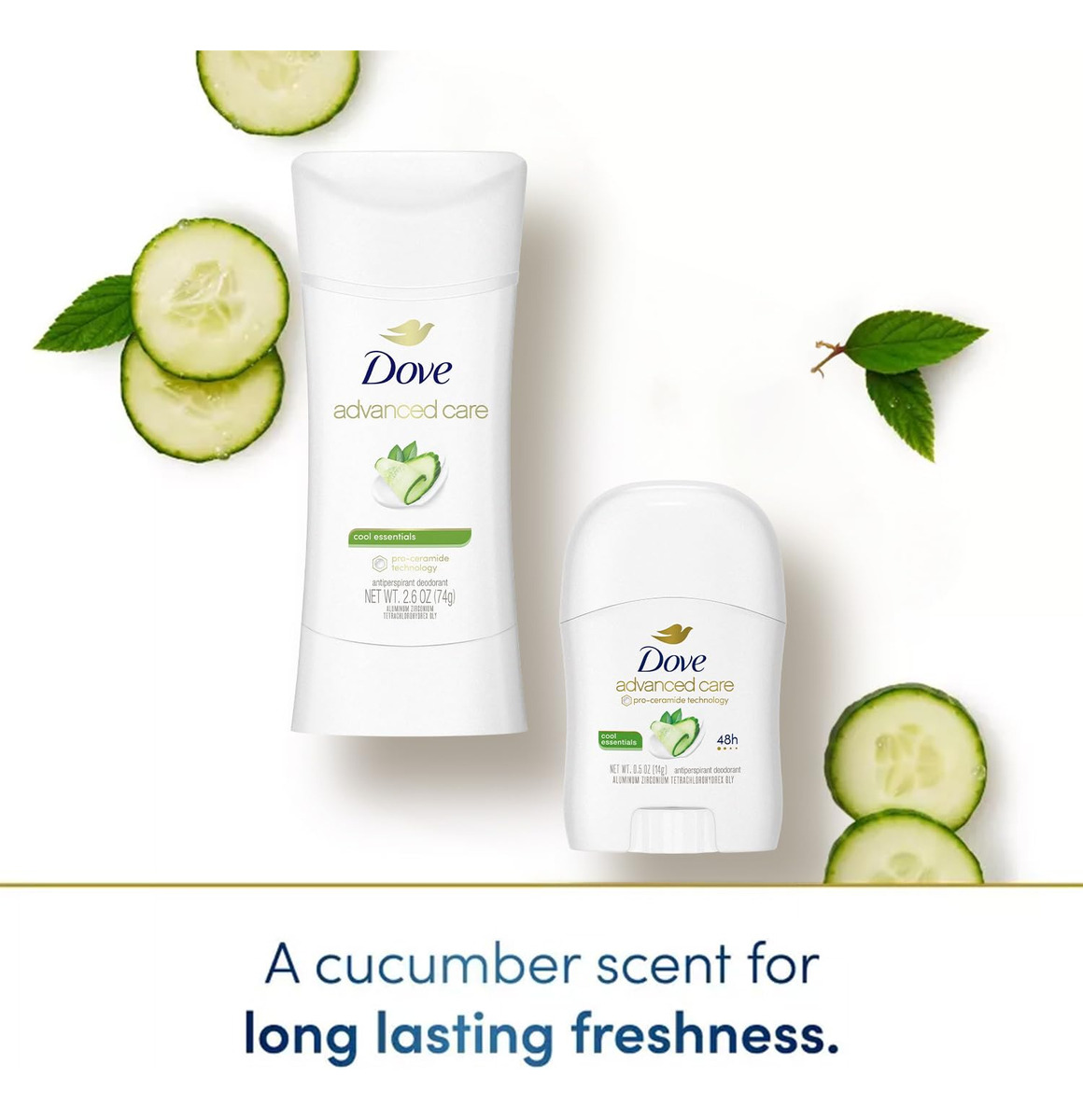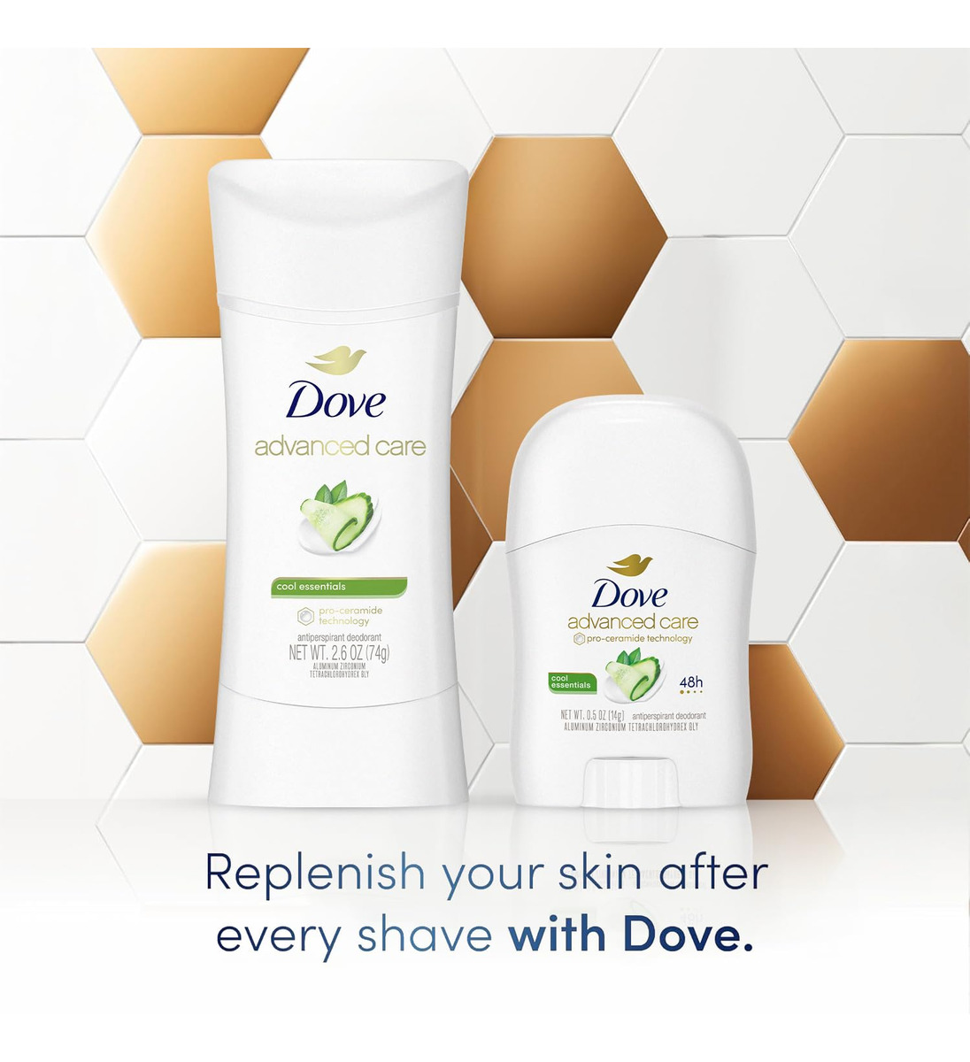 A pele lindamente macia e resiliente das axilas espera por você, cortesia de nossos desodorantes antitranspirantes Advanced Care Cool Essentials. Nossa fórmula cremosa deixará suas axilas macias e reabastecidas após o barbear. Infundidos com a tecnologia Pro-Ceramide, eles vão além da mera proteção contra odores para hidratar e reparar a barreira da pele. O aroma refrescante de chá verde e pepino elevará e energizará seus sentidos da manhã à noite. – DESODORANTE DOVE PARA MULHERES: este pacote conveniente inclui dois desodorantes antitranspirantes em tamanho real (2,6 onças por chá) e um desodorante de viagem (0,5 onças). – PERFUME REFRESCANTE: Delicie-se com o aroma revigorante e energizante de chá verde e pepino infundido em nosso fórmulas desodorantes e antitranspirantes hidratantes. – HIDRATANTE PARA A PELE: A tecnologia Dove Pro-Ceramide suaviza a pele ao repor as ceramidas esgotadas pelo barbear e ajuda a reparar a barreira de hidratação da pele. – SECAGEM RÁPIDA: Nossas fórmulas de secagem rápida em tamanho real oferecem proteção duradoura contra odores nas axilas e controle do suor para tranquilidade enquanto você passa o dia. – DOVE É APROVADO PELA PETA: Desde meados da década de 1980, a Dove usa métodos sem crueldade e sem animais para garantir a segurança de todos os produtos Dove.