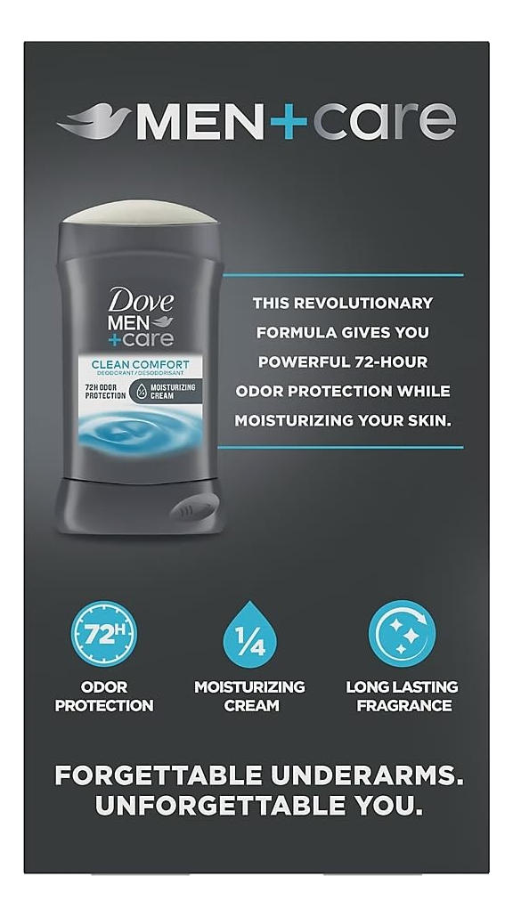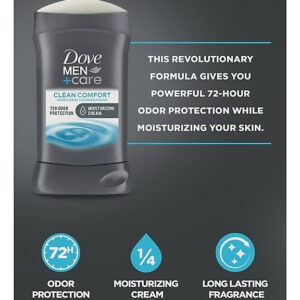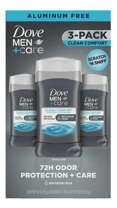 A fórmula do desodorante Dove Men+Care Clean Comfort não contém alumínio. O desodorante Dove Men+Care Clean Comfort oferece proteção poderosa contra odores por 72 horas enquanto cuida da pele. Este desodorante masculino sem alumínio Dove é formulado com 1/4 de creme hidratante para ajudar a reter a umidade da pele e ajudar a proteger contra irritações, proporcionando axilas mais confortáveis. Este desodorante masculino Dove apresenta uma fragrância sutil de longa duração para manter você se sentindo fresco e confiante o dia todo. Aplique este desodorante sem alumínio nas axilas para protegê-las do odor e garantir uma confiança duradoura 24 horas por dia. Cada bastão de desodorante Dove Men+Care pode ser reciclado. Siga as instruções do How2Recycle na parte traseira. O cuidado Dove vai além da proteção hidratante com a certificação PETA Cruelty-Free e embalagens plásticas recicláveis. – O desodorante Dove Men+Care Clean Comfort oferece uma poderosa proteção contra odores de 72 horas enquanto cuida de sua pele – O desodorante masculino sem alumínio da Dove é formulado com 1/4 de creme hidratante para ajudar a reter a umidade da pele e ajudar a proteger contra irritações e proporcionar axilas mais confortáveis. – O desodorante masculino Dove apresenta um creme hidratante duradouro fragrância sutil e saborosa para manter você se sentindo fresco e confiante o dia todo. – Cada desodorante em bastão Dove Men+Care pode ser reciclado . Siga as instruções do How2Recycle na parte traseira. Os desodorantes Dove Men+Care são certificados pela PETA como livres de crueldade. – Aplique este desodorante sem alumínio nas axilas para protegê-las do odor e ter confiança duradoura 24 horas por dia – Inclui desodorante sem alumínio para homens, 3 unidades/3 onças.