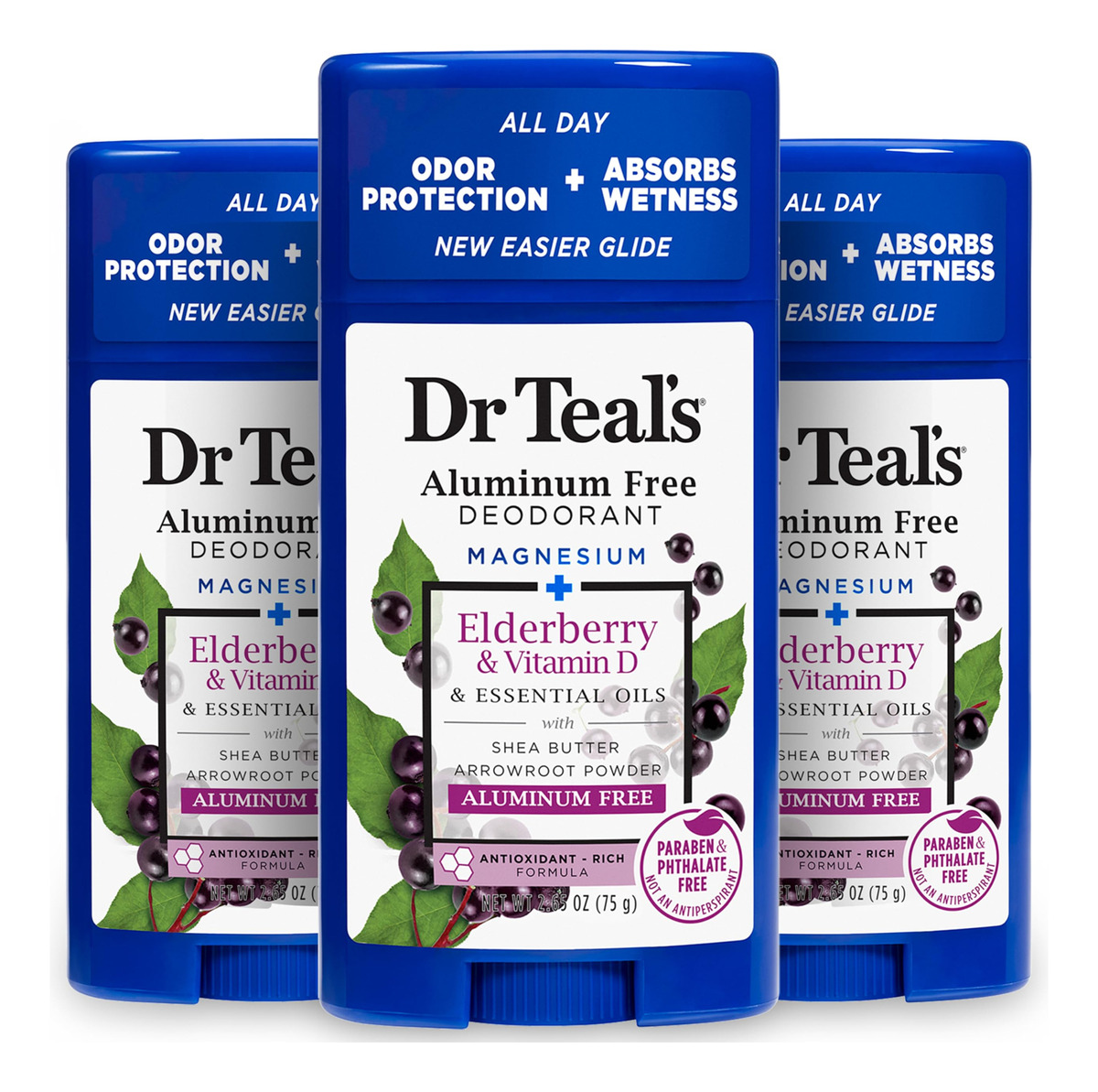 Desodorante Dr. Teal's sem alumínio, sabugueiro e vitamina D com óleos essenciais, 2,65 onças (pacote com 3) – CLINICAMENTE COMPROVADO: combate o odor e absorve a umidade o dia todo – MAGNÉSIO: poderoso desodorizante e mineral essencial para o corpo – PÓ DE ARARUTA E BICARBONATO DE SÓDIO: fornecem absorção de umidade durante todo o dia – AROMA DE SABUGUEIRO: O aroma doce e fresco de sabugueiro é rejuvenescedor – FÓRMULA DE CUIDADO: essencial óleos, óleo de coco, óleo de jojoba e manteiga de karité deixam sua pele com uma sensação e um cheiro excelentes o dia todo. Fácil aplicação: basta segurar a pele por alguns segundos para aquecer e ajudar com Glide — PROTEÇÃO DIÁRIA SUAVE: a fórmula sem alumínio funciona melhor quando aplicada diariamente — SEM INGREDIENTES AGRESSIVOS: sem parabenos e ftalatos