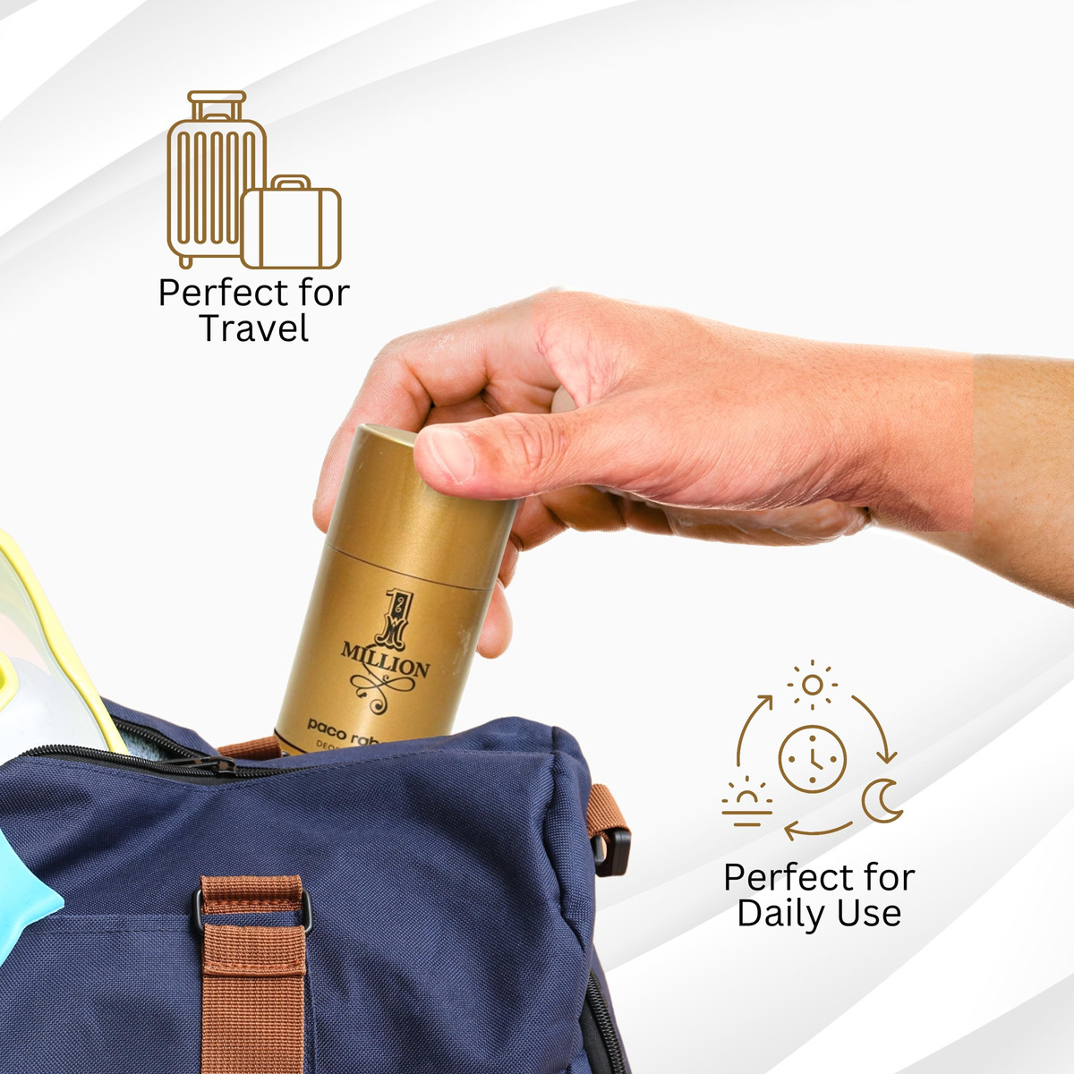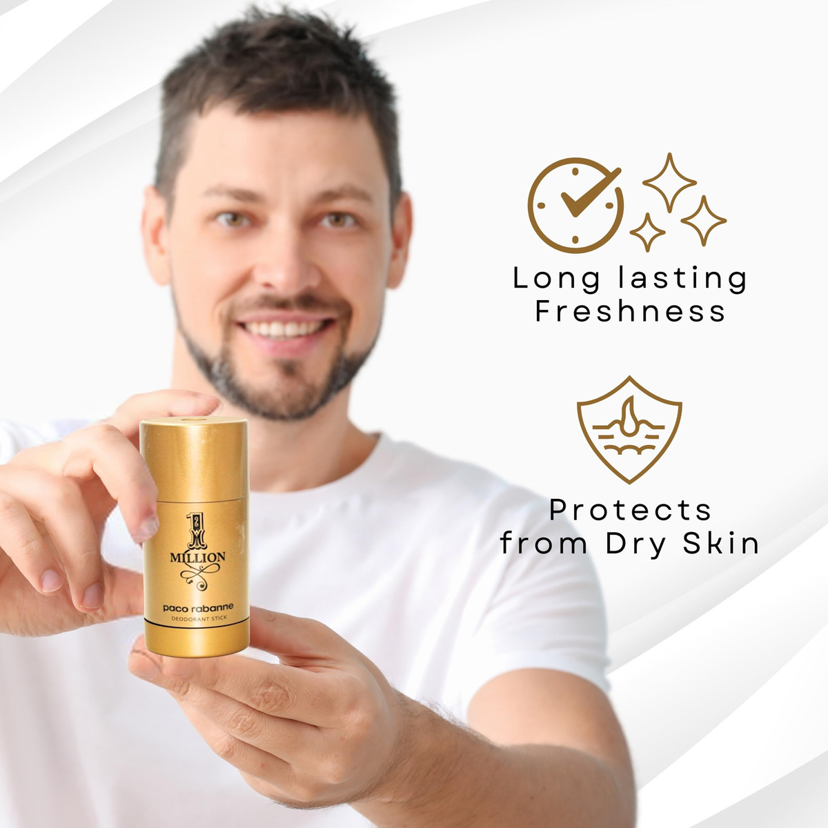 ONE MILLION for men foi lançado pela grife PACO RABANNE em 2008. Todo homem quer parecer um milhão de dólares e agora, graças aos designers de fragrâncias de Paco Rabanne, o cheiro de riqueza e estilo está disponível para todos. – Paco Rabanne 1 Million Stick 2.2 0z – Coleção One Million – Stick de desodorante para homens – Desodorante de luxo – Antitranspirante de viagem