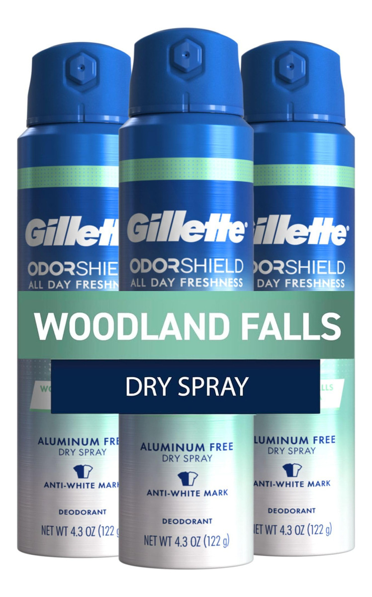 Desodorante masculino sem alumínio Gillette, spray seco Woodland Falls, 4,3 onças (pacote com 3) — Desodorante projetado para homens — A Gillette continua oferecendo o melhor que um homem pode obter com este incrível desodorante sem alumínio, oferecendo proteção contra odores e frescor durante todo o dia — Antimanchas brancas — Este spray sem alumínio foi desenvolvido com uma fórmula anti-manchas brancas — AJUDA A ELIMINAR O ODOR — O Gillette combate o odor na fonte – ALL DAY FRESHNESS – Obtenha frescor 24 horas com aplicação diária – Gillette The Best A Man Can Get
