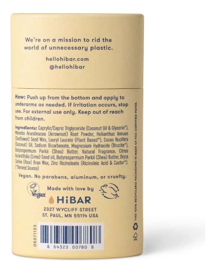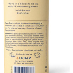 Conheça o desodorante HiBars natural, sem alumínio, sem parabenos e sem plástico. Este desodorante natural para homens e mulheres oferece proteção e desempenho durante todo o dia, sem produtos químicos ou ingredientes nocivos. E o tubo inovador é 100% reciclável. O desodorante sem plástico HiBars é formulado para deslizar sem esforço, garantindo uma sensação leve e refrescante debaixo dos braços. Nosso perfume de coco e baunilha é feito de ingredientes naturais e é adequado para homens e mulheres. Nosso desodorante sem plástico, feito com ingredientes naturais de alta qualidade, como cera de semente de girassol, manteiga de karité, farelo de arroz e óleo de semente de limão, que criam a consistência perfeita para facilitar a aplicação e manter o odor corporal sob controle. Esses ingredientes dignos de spa são seguros, eficazes e suaves para a pele. Formulado com zero corantes ou produtos químicos, nosso desodorante sem plástico é certificado como vegano. Todos os nossos produtos são certificados pela Leaping Bunny e são seguros para peles sensíveis. Cada tubo do nosso desodorante equivale a um recipiente de plástico guardado, por isso é tão suave para o planeta quanto para a pele. Diga olá ao HiBar e adeus ao plástico. Aqui na HiBar, oferecemos produtos de alta qualidade, sem plástico e sem água, eliminando mais de 7 milhões de garrafas plásticas e economizando mais de 1,5 milhão de galões de água desde 2018. Nossas embalagens são totalmente recicláveis ou compostáveis e nosso objetivo é atender você – e ao planeta – com produtos de beleza e cuidados pessoais 100% livres de plástico. – DESODORANTE SEM PLÁSTICO – Conheça o desodorante HiBars natural, sem alumínio, sem parabenos e sem plástico. Este desodorante natural para homens e mulheres oferece proteção e desempenho durante todo o dia, sem produtos químicos ou ingredientes nocivos. E o tubo inovador é 100% reciclável. – COCO E BAUNILHA – O desodorante sem plástico HiBars foi formulado para deslizar sem esforço, garantindo que seja leve e refrescante debaixo dos braços. Nosso aroma de coco e baunilha é feito de ingredientes naturais e é adequado tanto para homens quanto para mulheres. – INGREDIENTES LIMPOS – Nosso desodorante sem plástico, feito com ingredientes naturais de alta qualidade, como cera de semente de girassol, manteiga de karité, farelo de arroz e óleo de semente de limão, que cria a consistência perfeita para facilitar a aplicação e manter o odor corporal sob controle. Esses ingredientes dignos de spa são seguros, eficazes e suaves para a pele. – DESODORANTE NATURAL – Formulado sem corantes ou produtos químicos, nosso desodorante sem plástico é certificado como vegano. Todos os nossos produtos são certificados pela Leaping Bunny e são seguros para peles sensíveis. Cada tubo do nosso desodorante equivale a um recipiente de plástico guardado, por isso é tão suave para o planeta quanto para a pele. – BELEZA EM UMA MISSÃO – Diga olá ao HiBar e adeus ao plástico. Aqui na HiBar, oferecemos produtos de alta qualidade, sem plástico e sem água, eliminando mais de 7 milhões de garrafas plásticas e economizando mais de 1,5 milhão de galões de água desde 2018. Nossas embalagens são totalmente recicláveis ou compostáveis e nosso objetivo é servir você – e o planeta – com produtos de beleza e cuidados pessoais 100% livres de plástico.