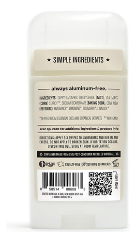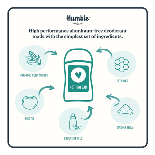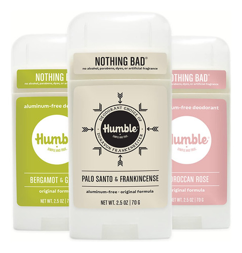 Amido de milho: O amido de milho é um ingrediente natural altamente eficaz na absorção de umidade, resultando em um efeito de secagem que ainda permite que o corpo sue. Óleo de coco fracionado: O óleo de coco fracionado é processado para ser líquido à temperatura ambiente e tem uma vida útil estável. É rico em ácido cáprico e caprílico, que apresentam propriedades antioxidantes, oferecendo uma textura sedosa e suave, adequada para clientes com pele sensível e que não obstrui os poros. Cera de abelha: hidrata a pele e proporciona aquela sensação fácil de deslizar que todos nós amamos em Humble. Bicarbonato de sódio totalmente natural: o bicarbonato de sódio absorve e neutraliza os odores corporais sem submeter a pele a substâncias químicas nocivas e desagradáveis. É derivado naturalmente, então você sabe que está obtendo o melhor que a natureza tem a oferecer. Óleo essencial: encontrados em nossas variedades perfumadas, os óleos essenciais fornecem essências calmantes e aromáticas para a Humble. Nosso especialista em formulações prioriza a escolha de óleos essenciais da mais alta qualidade e colhidos de forma sustentável. – DESODORANTE SEM ALUMÍNIO: feito com 4 ingredientes simples: bicarbonato de sódio, amido de milho não transgênico, MCT de coco com certificação Ecocert COSMOS, cera de abelha, óleos essenciais e extratos botânicos. – NADA DE RUIM: Sem alumínio, álcool, corantes, parabenos ou fragrâncias artificiais. – EFICAZ: fornece odor eficaz controle e absorção de umidade, como os desodorantes tradicionais, ao mesmo tempo em que permite que as funções naturais do seu corpo permaneçam ininterruptas. – CRUELDADE CERTIFICADA- GRATUITO: Certificado como livre de crueldade pelo Programa de Certificação Leaping Bunny, que é o padrão-ouro internacional para produtos de consumo não testados em animais. – Feito com cuidado: formulado com ingredientes simples e eficazes, óleos essenciais e extratos botânicos para criar nossas misturas de aromas exclusivas. – Pacote variado: este pacote de 3 inclui três palitos originais de tamanho real sem alumínio, um de cada: bergamota e gengibre, rosa marroquina e Palo Santo e Frankfurt incenso. Com alguns dos nossos aromas mais populares, este trio abrange as bases do cítrico ao floral e ao amadeirado. Algo para todos os gostos.