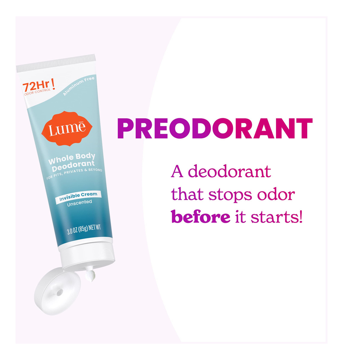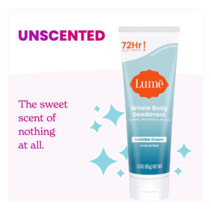 PRIMEIRO DESODORANTE DE CORPO INTEIRO DO MUNDO Sem fragrâncias ou óleos essenciais para quem prefere não adicionar aromas. O tubo de desodorante Invisible Cream, ideal para viagens, da Lume, permite que você controle facilmente a quantidade que usa. Use as pontas dos dedos para passar o creme dispensado em poços, recipientes ou em qualquer outro lugar onde você tenha odor, mas gostaria de não ter. Nossa fórmula à base de água não mancha suas roupas e não deixa resíduos. Usando a quantidade recomendada do tamanho de uma ervilha, o tubo oferecerá 150 aplicações nas axilas (duas axilas) ou 300 em qualquer outro lugar. Um pouco vale muito. – Cheire melhor em qualquer lugar – Controle o odor de coxas, partes íntimas e muito mais, como pés, seios, umbigos, dobras abdominais, rachaduras nas nádegas, rugas nas coxas ou em qualquer outro lugar onde você tenha odor, mas gostaria de não ter. – Extremamente eficaz – Está clinicamente comprovado que o lúmen bloqueia o odor corporal o dia todo e continua controlando o odor por 72 horas. – ALIMENTADO PELA CIÊNCIA – Nossa fórmula é pH otimizado para bloquear o odor antes que ele comece. Você pode até mesmo nos chamar de Preodorant! Certos desodorantes tradicionais simplesmente mascaram ou neutralizam o odor após sua formação. – UNIFORMIZA VISUALMENTE O TOM DA PELE – Está clinicamente comprovado que esfolia e reduz a aparência de hiperpigmentação. Hipoalergênico, sem bicarbonato de sódio e adora a pele até mesmo de nossas partes mais sensíveis. – Sem perfume – A escolha ideal para quem não prefere o perfume de absolutamente nada. Nosso creme invisível se esfrega como uma loção. Comece com uma quantidade do tamanho de uma ervilha e aplique em qualquer canto e fenda.