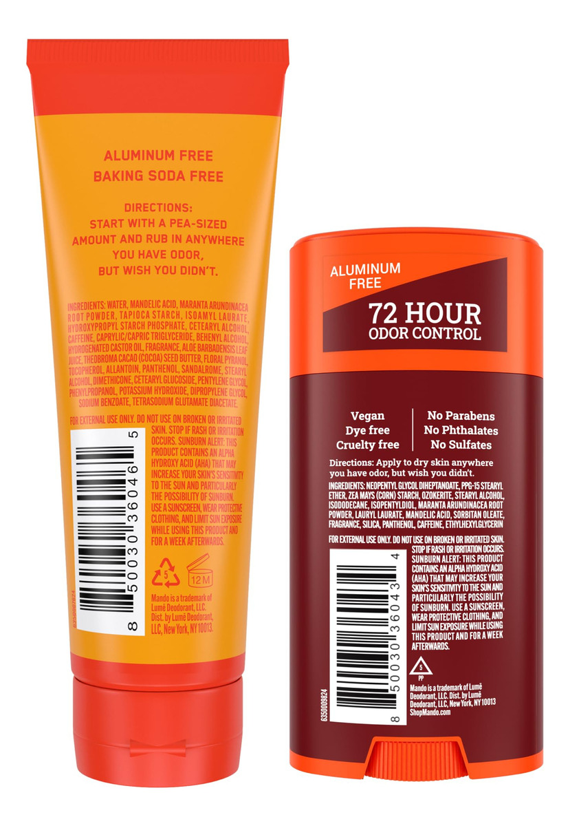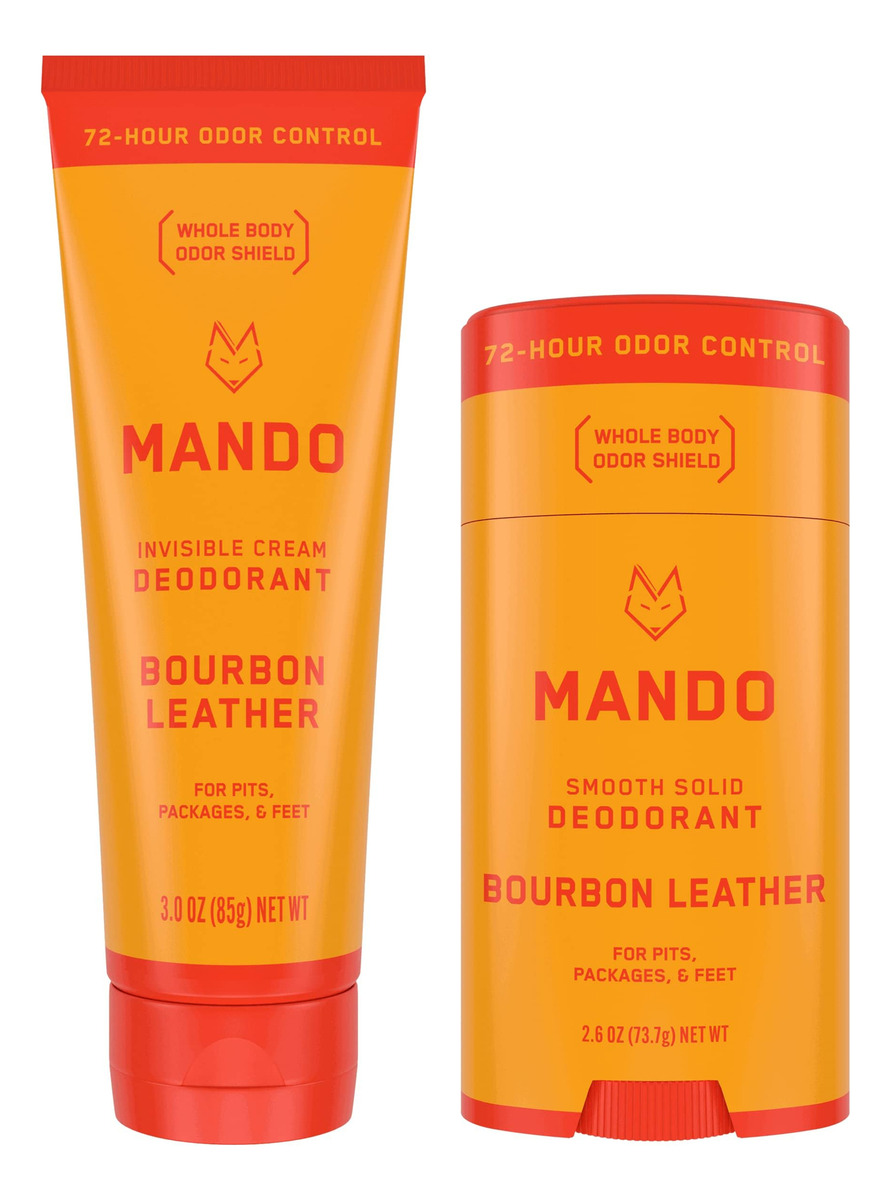 CHEIRE MELHOR EM QUALQUER LUGAR — Controle de odores em covas, embalagens e pés ou em qualquer outro lugar onde você tenha odor, mas gostaria de não ter. ALTO DESEMPENHO — Está clinicamente comprovado que o Mando bloqueia o odor corporal durante todo o dia e continua a controlar o odor por 72 horas. IMPULSIONADA PELA CIÊNCIA — Em vez de encobrir o odor após sua formação, nossa fórmula tem pH otimizado para bloquear o odor antes que ele comece. Você pode até nos chamar de Preodorant! SERIAMENTE SEGURO – Desenvolvido por médicos e seguro para qualquer uso externo. Formulado sem benzeno. Livre de alumínio, bicarbonato de sódio, corantes e parabenos. Hipoalergênico e suave o suficiente até mesmo para suas partes mais sensíveis. Sem perfume — Cheire como você sem o bastão sólido B.O. (1) de 2,6 onças e (1) o tubo de 3 onças. O Smooth Solid desliza suavemente em qualquer lugar onde você quiser controlar o odor, e o creme invisível se esfrega como uma loção. – CHEIRA MELHOR EM QUALQUER LUGAR – Controle de odor em caroços, embalagens e pés. Pense em sacos de bolinhas, rachaduras nas nádegas, rugas nas coxas ou em qualquer outro lugar em que você tenha odor, mas gostaria de não ter. – ALTO DESEMPENHO – Está clinicamente comprovado que o Mando bloqueia o odor corporal o dia todo e continua controlando o odor por 72 horas. – ALIMENTADO PELA CIÊNCIA – Em vez de encobrir o odor após sua formação, nossa fórmula tem pH otimizado para bloquear o odor antes que ele comece. Você pode até nos chamar de Preodorant! – SERIAMENTE SEGURO – Desenvolvido por médicos e seguro para qualquer uso externo. Formulado sem benzeno. Livre de alumínio, bicarbonato de sódio, corantes e parabenos. Hipoalergênico e seguro para a pele até mesmo em nossas partes mais sensíveis. – COURO DE BOURBON – Couro, tabaco e baunilha de bourbon. (1) bastão sólido de 2,6 onças e (1) tubo de 3 onças. Nosso Smooth Solid desliza suavemente em qualquer lugar onde você deseja controlar o odor, e o Invisible Cream se esfrega como uma loção.