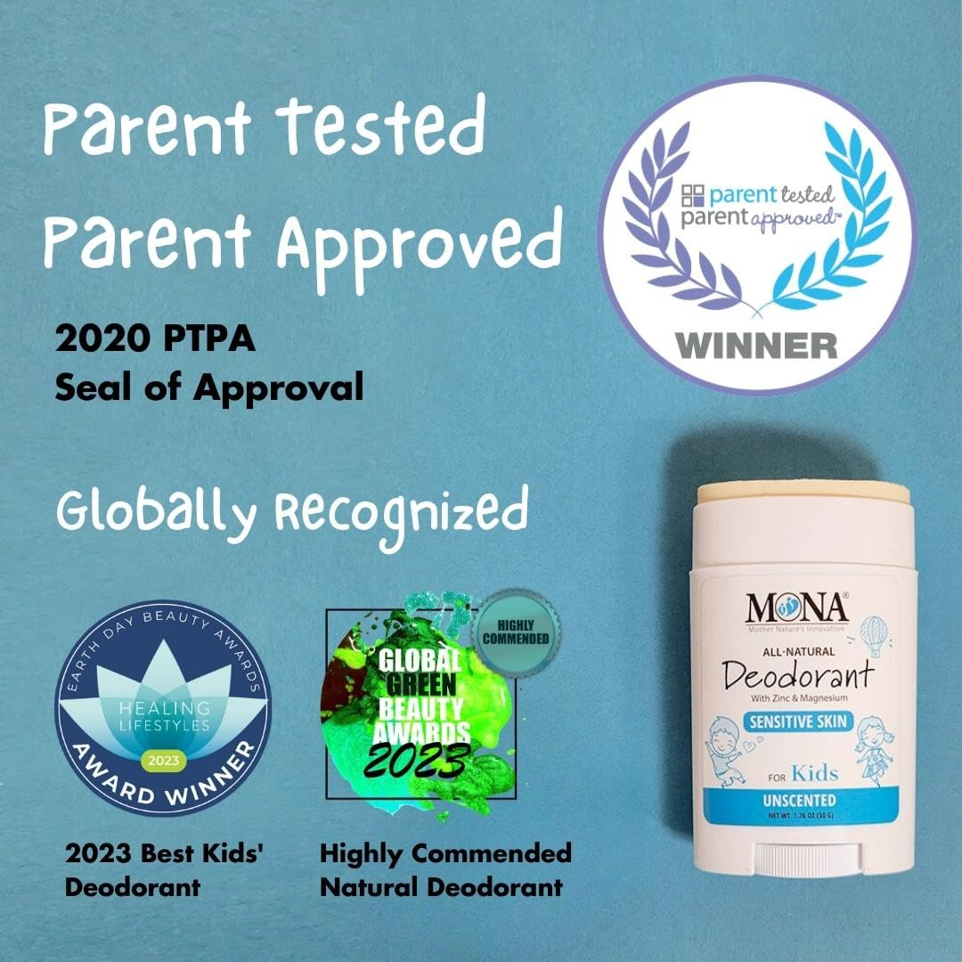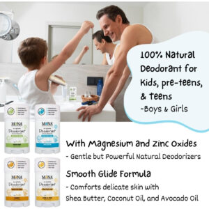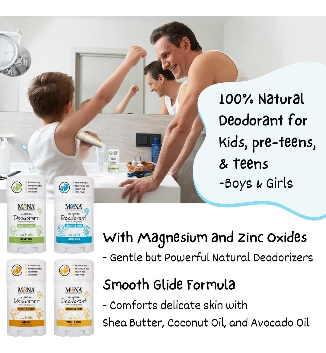 A MONA Brands apresenta desodorantes orgânicos totalmente naturais para crianças, adequados para meninos e meninas. Nossos desodorantes têm pH balanceado e não são tóxicos; livres de alumínio, parabenos, propilenoglicol e bicarbonato de sódio. Os pais estão preocupados com os ingredientes dos desodorantes usados pelos filhos. Nosso fundador usa seus mais de 25 anos de experiência nas indústrias cosmética e farmacêutica para desenvolver desodorantes seguros e eficazes, desenvolvidos usando protótipos de chumbo após várias formulações em nosso laboratório. Nossos desodorantes não irritantes são fáceis de usar e não deixam resíduos brancos pegajosos na pele. Sua pele e nossa ciência trabalham juntas. Todos os nossos desodorantes são feitos à mão em nossas próprias instalações em Massachusetts, EUA. Nunca testamos nossos produtos em animais. Esperamos que os pais não se preocupem e que os pré-adolescentes e adolescentes possam se refrescar, ter um controle duradouro do odor e atender às suas necessidades de desintoxicação. Nossos produtos são feitos para peles sensíveis com ingredientes naturais que são conhecidos por terem um efeito calmante. Nosso objetivo é tornar os cuidados pessoais seguros, eficazes e fáceis, desenvolvendo produtos que todos possam usar com confiança. – DESODORANTE 100% NATURAL SEM ALUMÍNIO PARA CRIANÇAS Formulado usando apenas ingredientes vegetais seguros e sem produtos químicos agressivos. Uma forma natural e orgânica de neutralizar o odor e manter as axilas secas, saudáveis, frescas e cheirosas o dia todo! – DESODORANTE HIPOALERGÊNICO PARA MENINOS E MENINAS: Enriquecido com ÓXIDOS VITAIS DE MAGNÉSIO E ZINCO, os desodorizantes naturais mais suaves e poderosos para peles sensíveis. Sem bicarbonato de sódio e propilenoglicol — sem coceira, erupções cutâneas ou erupções cutâneas. — Desodorante infantil totalmente natural e premiado, sem substâncias químicas nocivas, sem alumínio, álcool, talco, vaselina, parabenos, fragrâncias artificiais, cores ou conservantes; somente minerais naturais e ingredientes vegetais. — Desenvolvido por um médico e pais. Desodorante em bastão sem água e com pH balanceado que funciona — Absorve naturalmente suor e combate o odor corporal. Nosso desodorante seguro, não tóxico, não transgênico e vegano vem em diferentes aromas que seus filhos vão adorar! – DISPONÍVEL EM TAMANHO DE VIAGEM CONVENIENTE Não consegue decidir qual perfume comprar? Experimente todos juntos nesses mini pacotes de desodorantes! Perfeitamente portátil para seu filho carregar com eles. Disponível em todos os quatro aromas | Orgulhosamente feito à mão em pequenos lotes em Massachusetts, EUA; garantia de devolução do dinheiro em 30 dias.