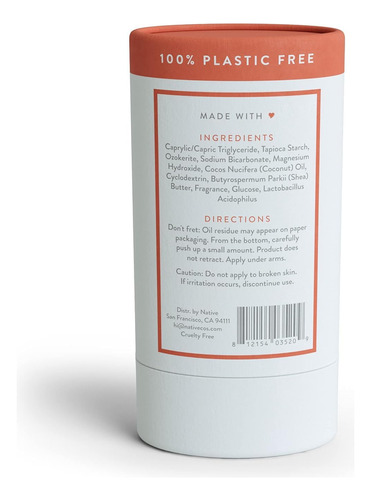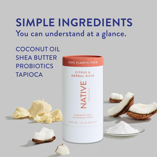 Limpo. Simples. Eficaz. Desodorante sem plástico. Ingredientes de origem natural – Pegamos o que a Mãe Terra fez e fizemos com que fizesse maravilhas. Livre de crueldade e vegano – Só testamos nossos produtos em animais festeiros (humanos voluntários). Nascido nos EUA – A Native foi fundada em São Francisco e todos os nossos produtos são fabricados nos EUA. – Almíscar cítrico e herbáceo – Picante e amadeirado, com notas brilhantes de laranja e limão, esse perfume é realista, mas cheira bem. – Proteção eficaz – Testamos milhares de ingredientes antes de encontrar uma receita que pareça leve e fresca sob seus braços, mas que ofereça proteção eficaz contra odores. – Goes Easy – Native O desodorante é um desodorante sólido que você pode aplicar facilmente. Também usamos fragrâncias seguras, sintéticas e sustentáveis (sem ftalatos) e fragrâncias naturais. – Livre de crueldade – O desodorante nativo nunca é testado em animais, exceto em humanos que se voluntariam para experimentar o desodorante Native. – Para homens e mulheres – A fórmula premiada de alto desempenho da Native é forte o suficiente para homens e mulheres. Tudo o que você precisa escolher é o seu perfume favorito.