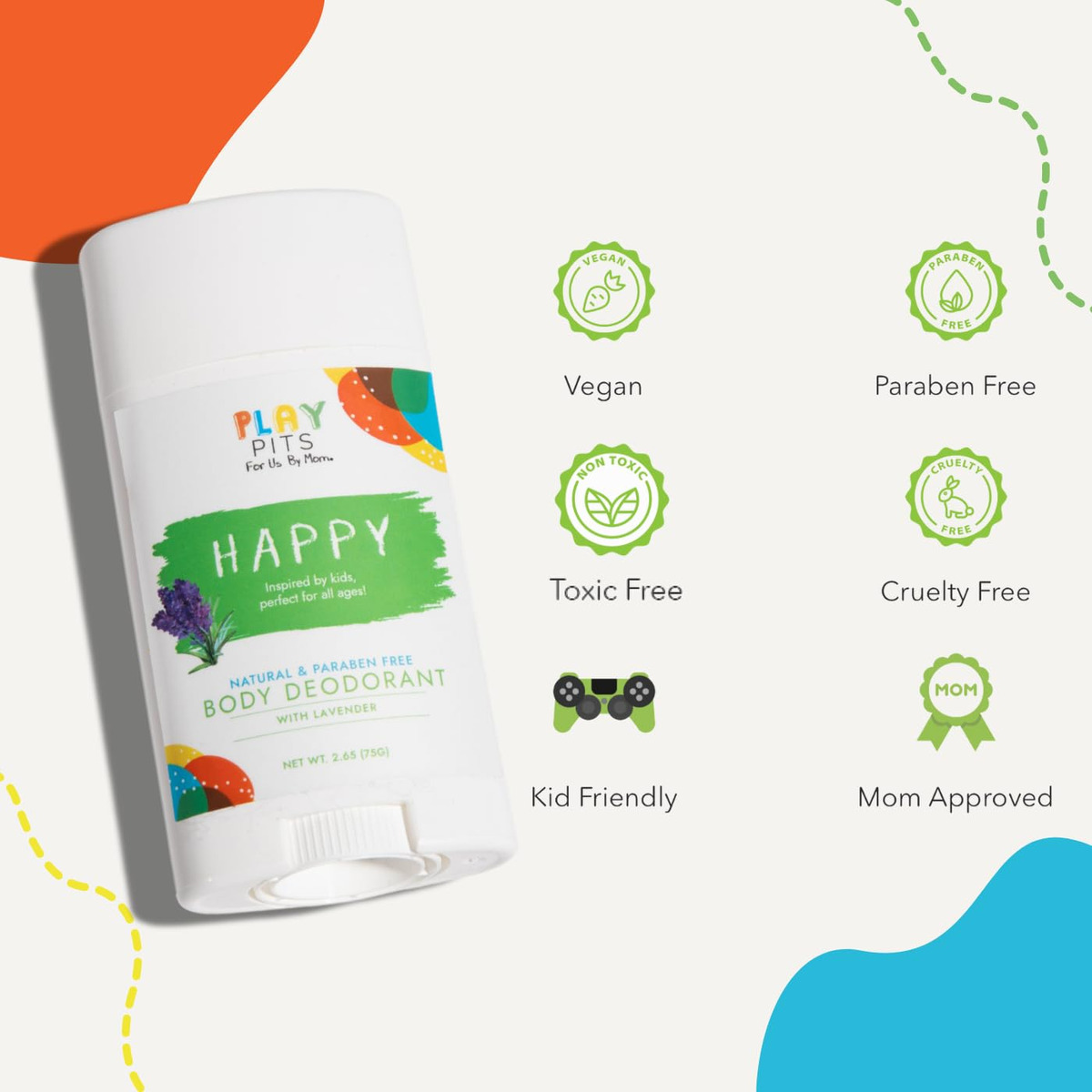 PLAY PITS — Desodorante natural de corpo inteiro para crianças — Seguro para meninas e meninos com pele sensível de todas as idades — Limpo — Recheio de meias — Perfume feliz — Infundido com óleos essenciais de lavanda 2,65 onças — Happy: mesmo nos dias mais monótonos, Happy pode virar sua testa de cabeça para baixo; Happy é infundido com óleo essencial de lavanda e ajuda a manter a pele seca afastada; The Lavender in Happy pode também aumentam a sensação de relaxamento e tranquilidade — Ingredientes aprovados pela mãe: cada ingrediente foi pessoalmente selecionado, testado e elaborado com o amor da mãe; peles suaves e sensibilidades cutâneas estávamos em mente quando criamos a fórmula de nossos produtos – All Natural: desodorante que usa ingredientes não tóxicos da melhor qualidade que são seguros para todos; não contém parabenos ou fragrâncias sintéticas – Proteção eficaz: não acreditamos em bloquear as glândulas sudoríparas do corpo; em vez disso, temos uma opção segura; nosso desodorante trabalha com seu corpo para absorver a umidade e combater odores para mantê-lo fresco dia e noite; nosso duradouro o desodorante mantém você protegido durante seus dias mais ativos – Perfeito para toda a família: While Play Pits é inspirado em crianças, é perfeito para todas as idades; temos orgulho em fornecer um produto familiar que crianças de até 2 anos e avós com até 102 anos de idade podem gostar de usar todos os dias